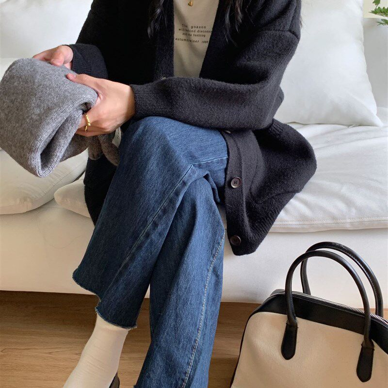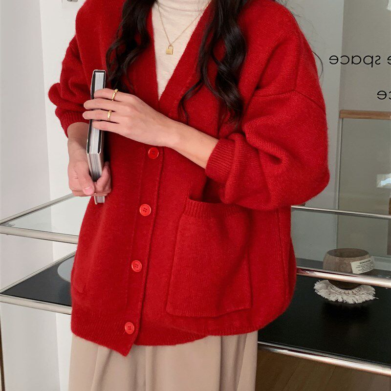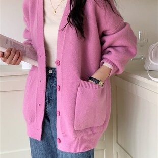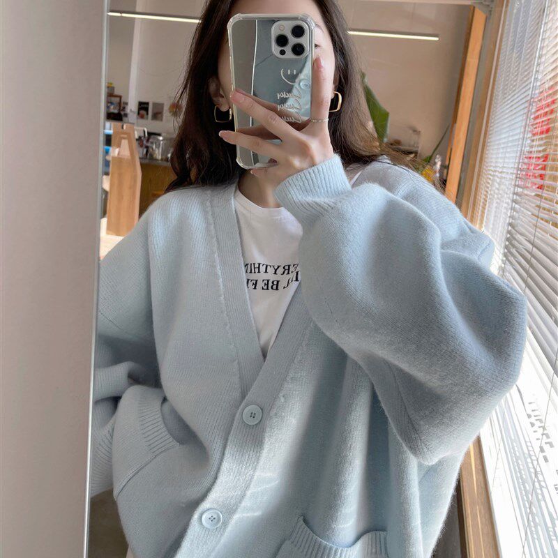 速发蓝套奶系秋冬毛衣开衫 懒慵风宽松V领温柔针织外色上衣 202新款