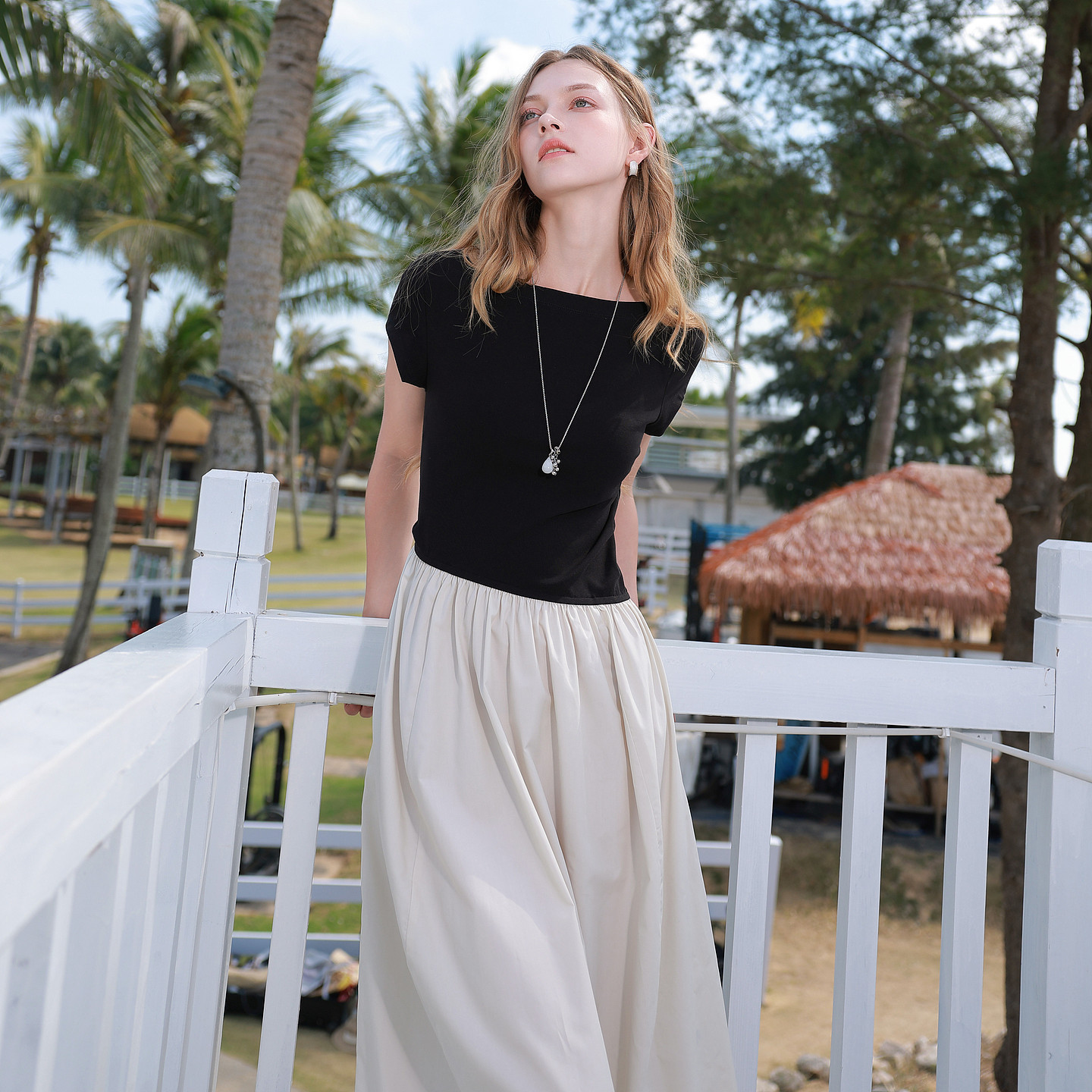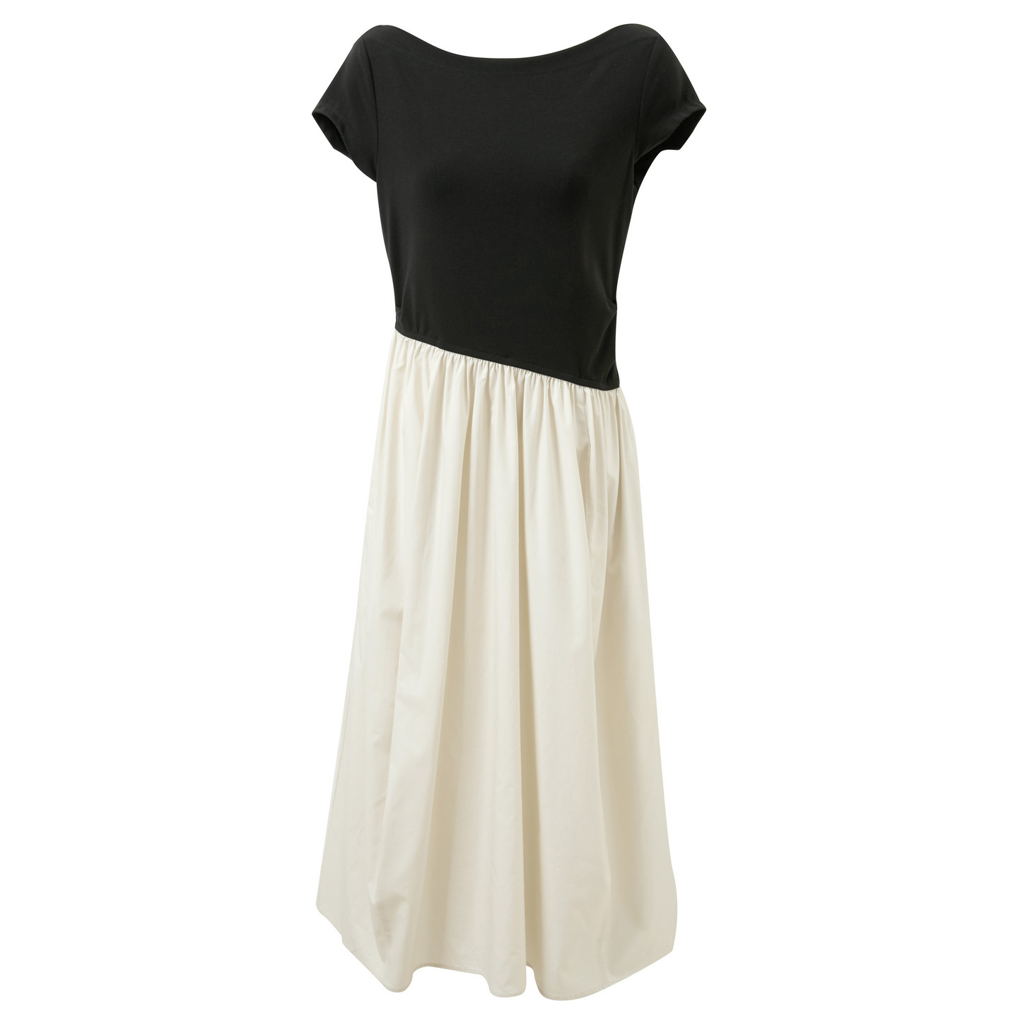 三彩2026夏季 简约设计感假两件连衣裙一字领收腰A字长裙M女 新款