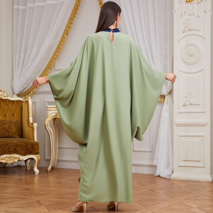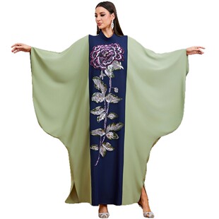优雅蝙蝠袖 气质度假撞色拼接珠片重工刺绣中东阿拉伯连衣裙长袍