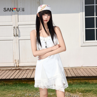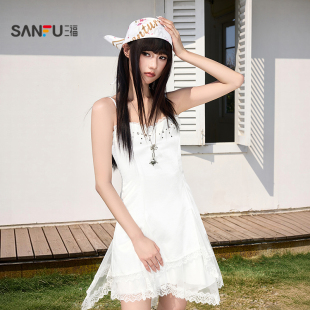三福连衣裙2026夏季 521093 网纱蕾丝拼接不规则摆收腰裙子女装