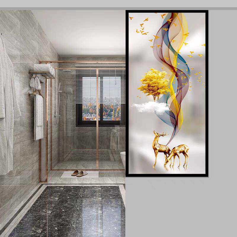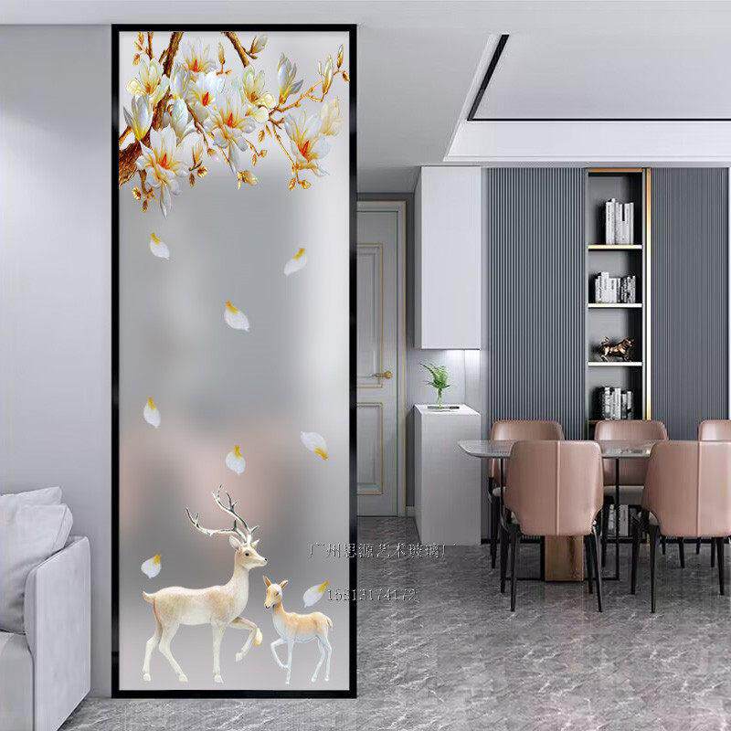 钢化艺术玻璃屏风隔断装 饰客厅玄关柜过道双面透光彩绘磨砂发财鹿