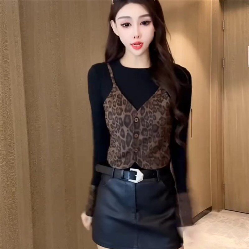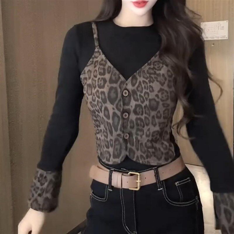 豹纹吊带拼接假两件小众T恤修身 洋气时尚 上衣女 打底衫 豹纹小衫