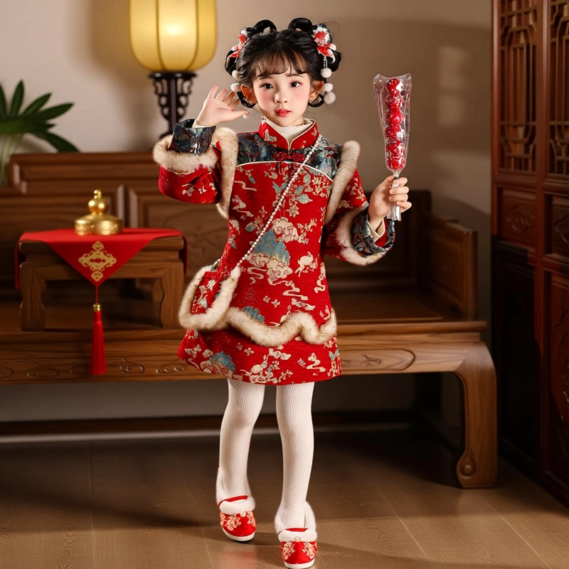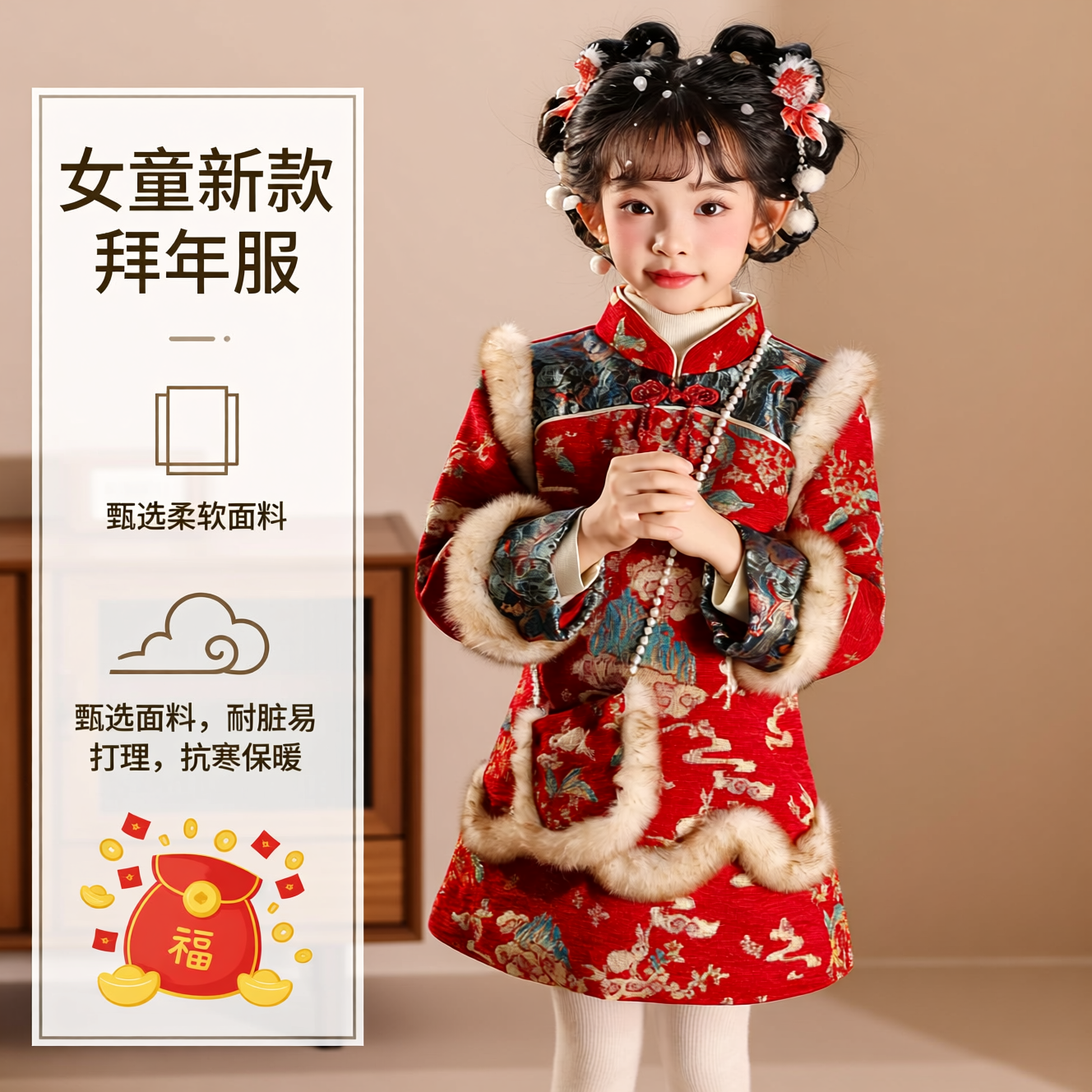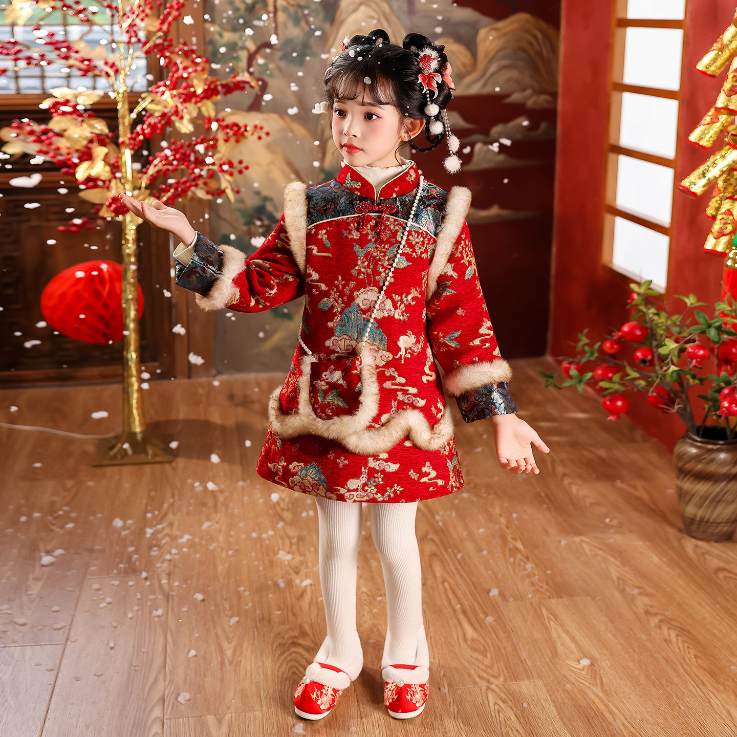 加厚中小童喜庆拜年服冬 中国风宝宝新中式 女童旗袍连衣裙冬装 新款
