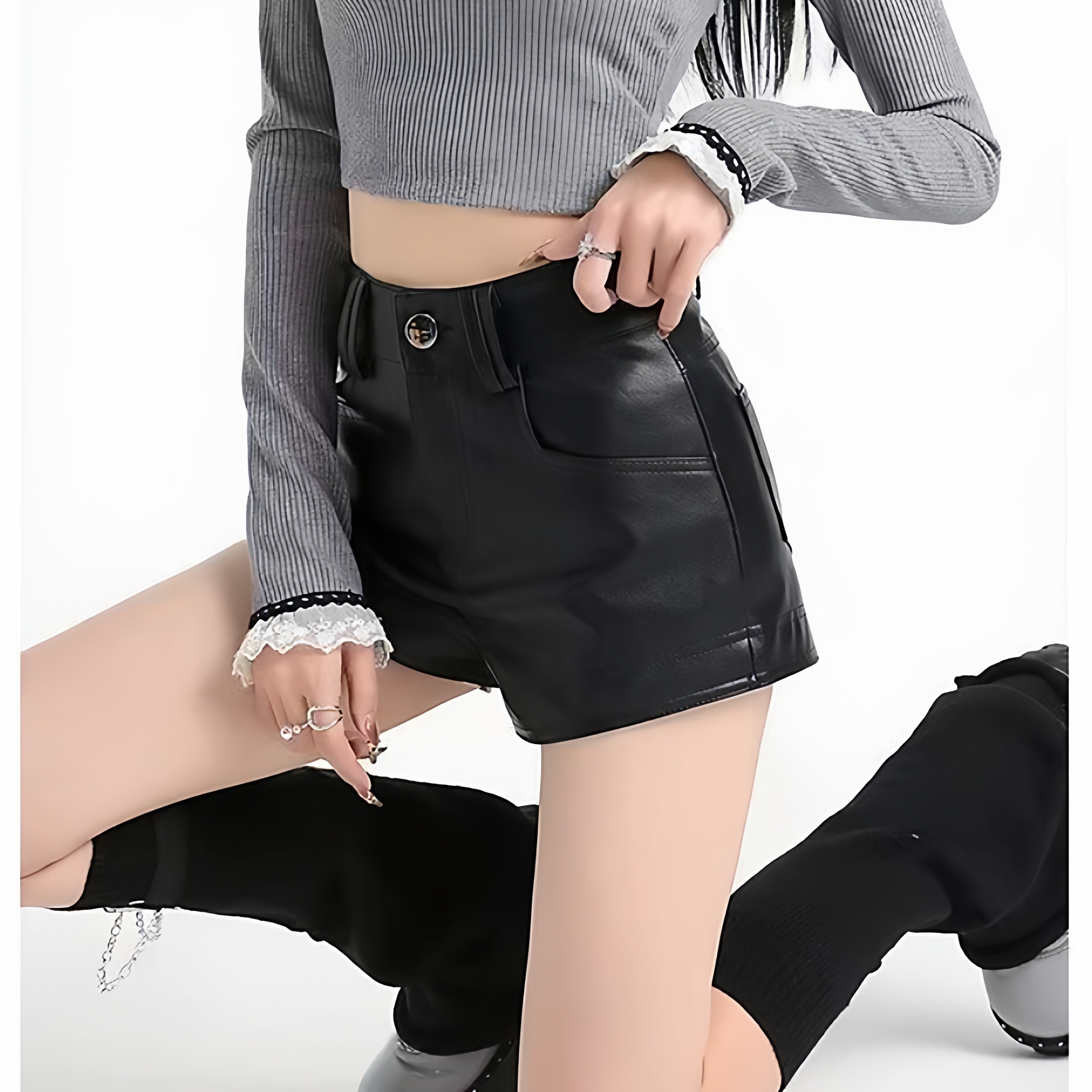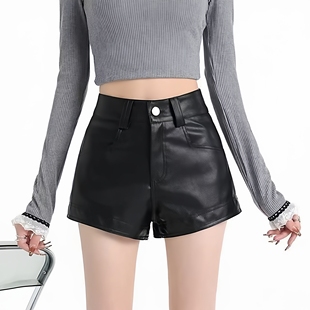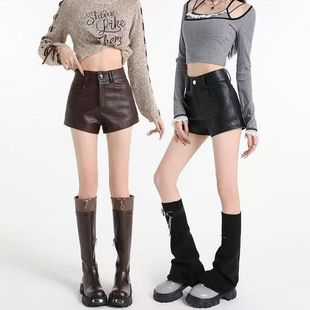 外穿 高腰显瘦辣妹百搭a字阔腿靴裤 咖色pu皮短裤 女秋冬2025新款