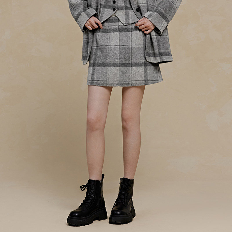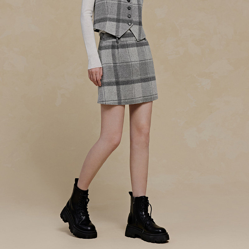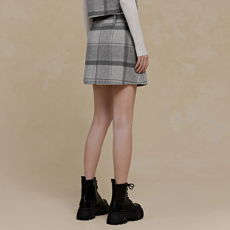 PIT100%绵羊毛半身短裙2026春季 格纹百搭显瘦高腰裙 新款