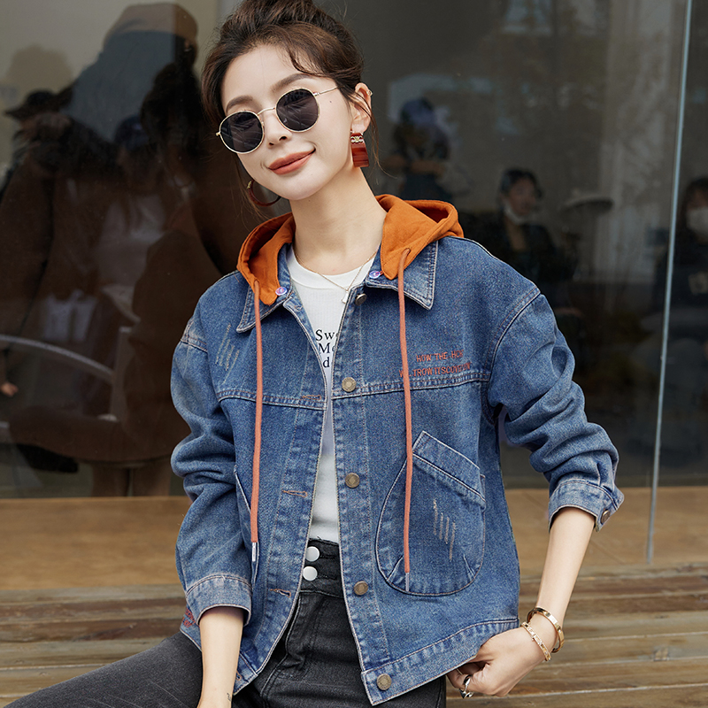 复古宽松水洗韩版 连帽撞色翻领上衣女 女士牛仔外套女2025春秋新款