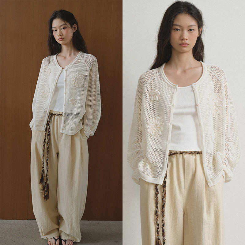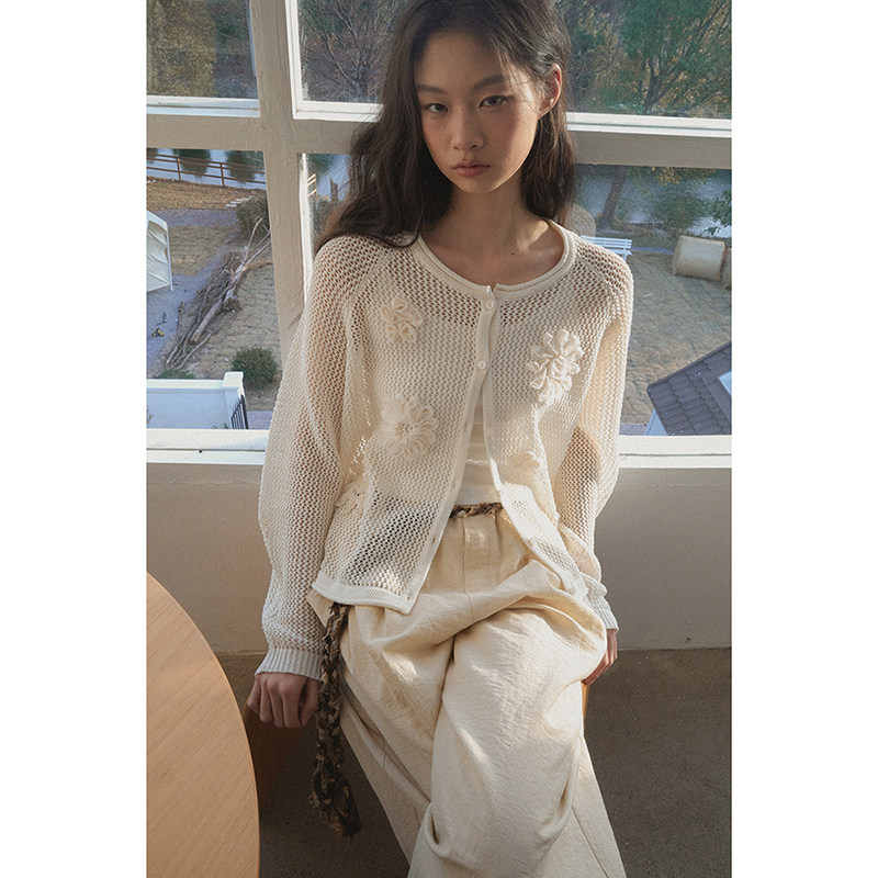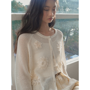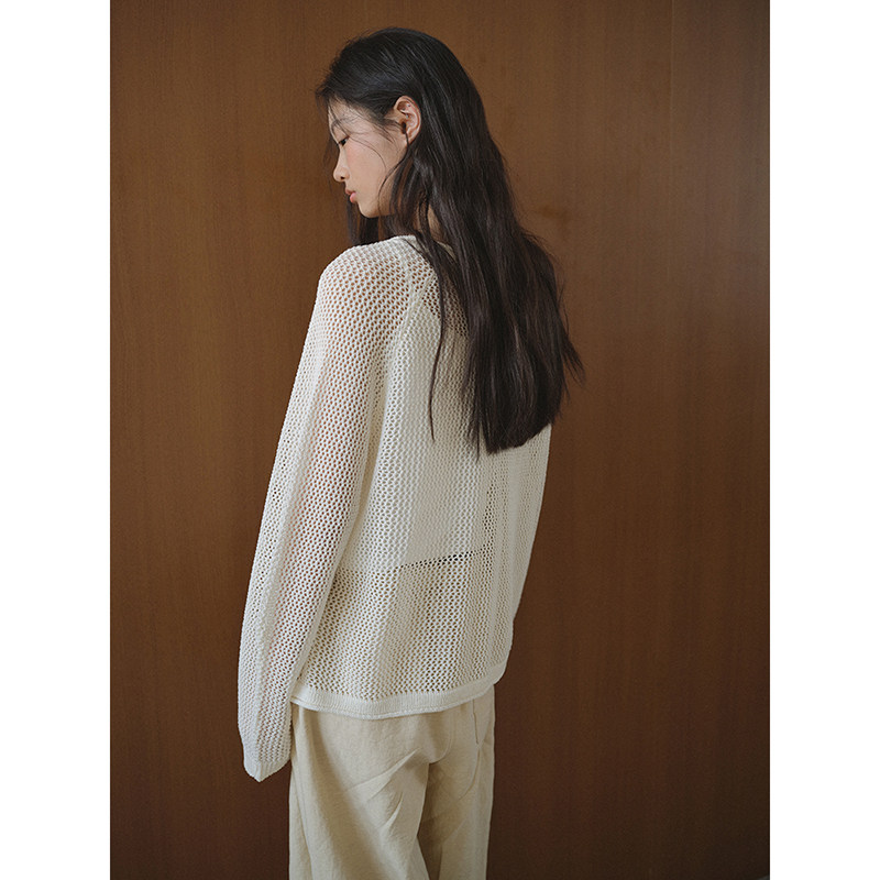 上衣女 圆领叠穿长袖 popchrio 莱赛尔亚麻混纺盘带绣镂空针织开衫