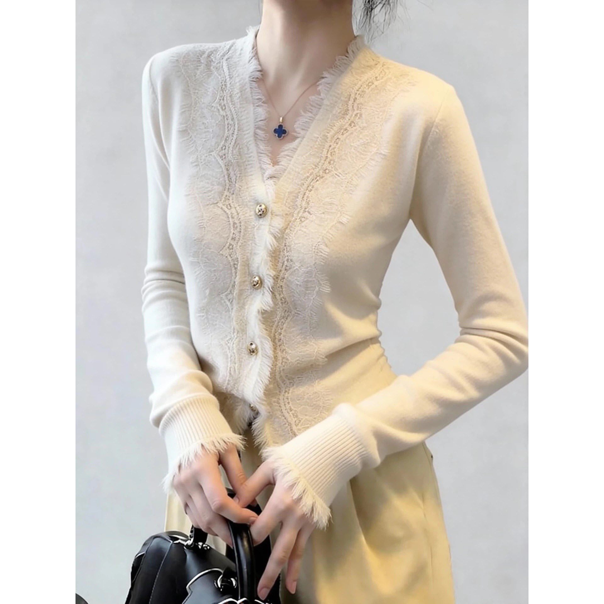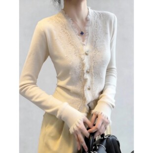 T恤显瘦时髦上衣 女秋冬皮草内搭白色针织长袖 法式 蕾丝V领打底衫