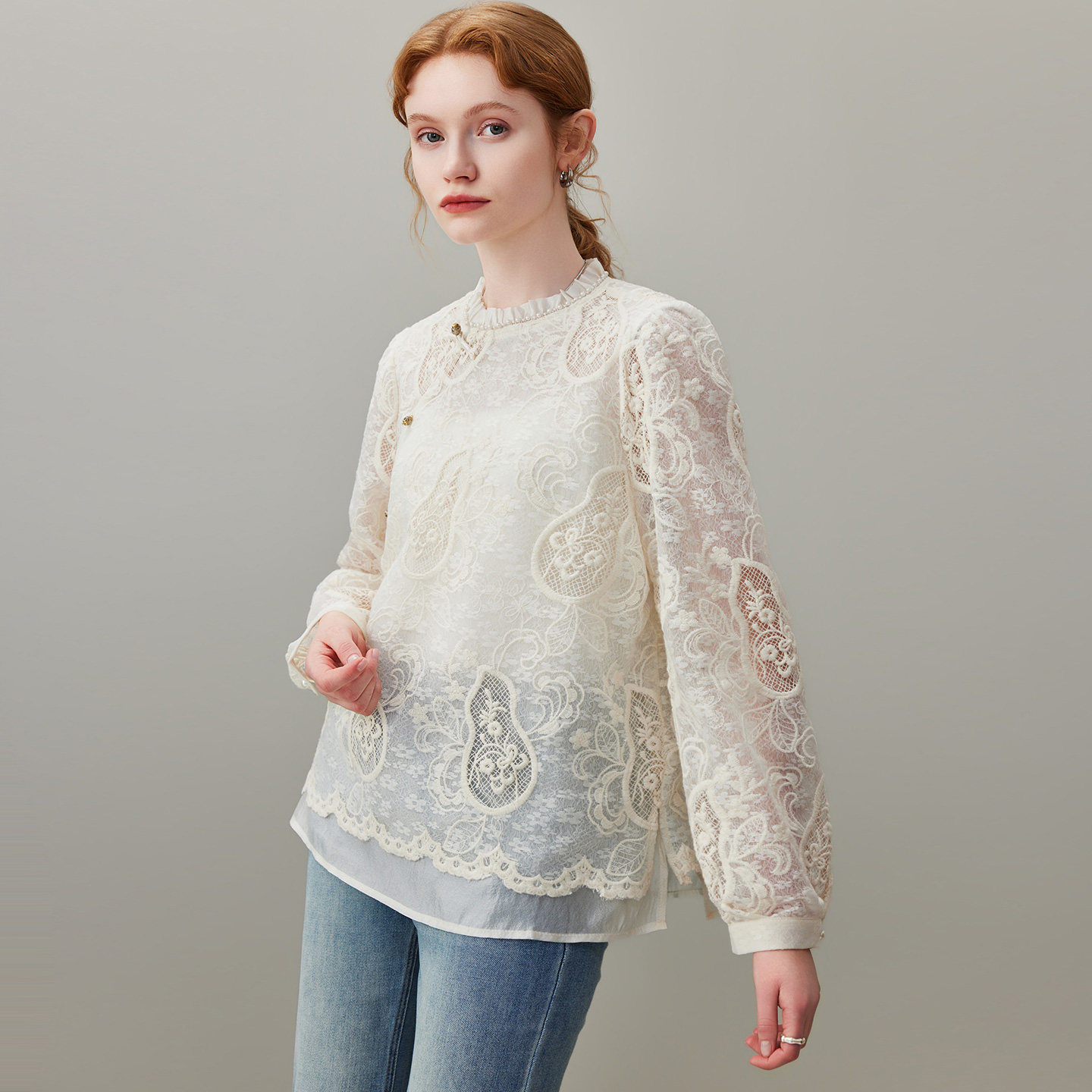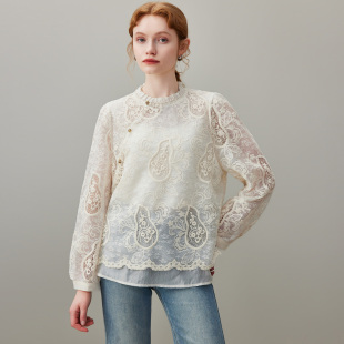 宽松圆领重工刺绣小衫 dfvc复古钩花镂空长袖 新款 女2026年春季 衬衫
