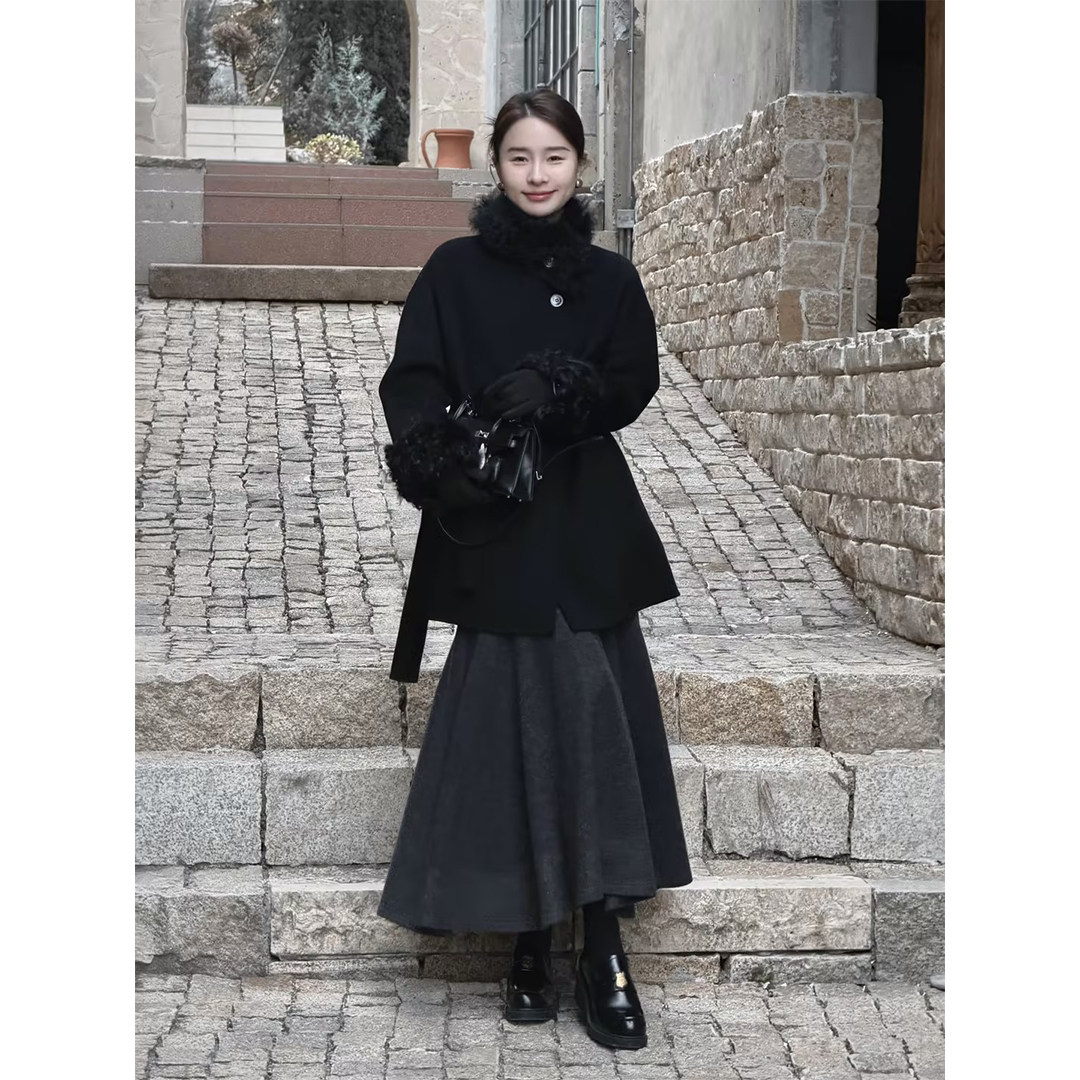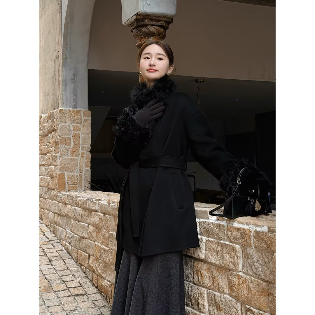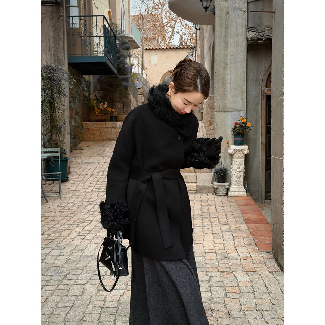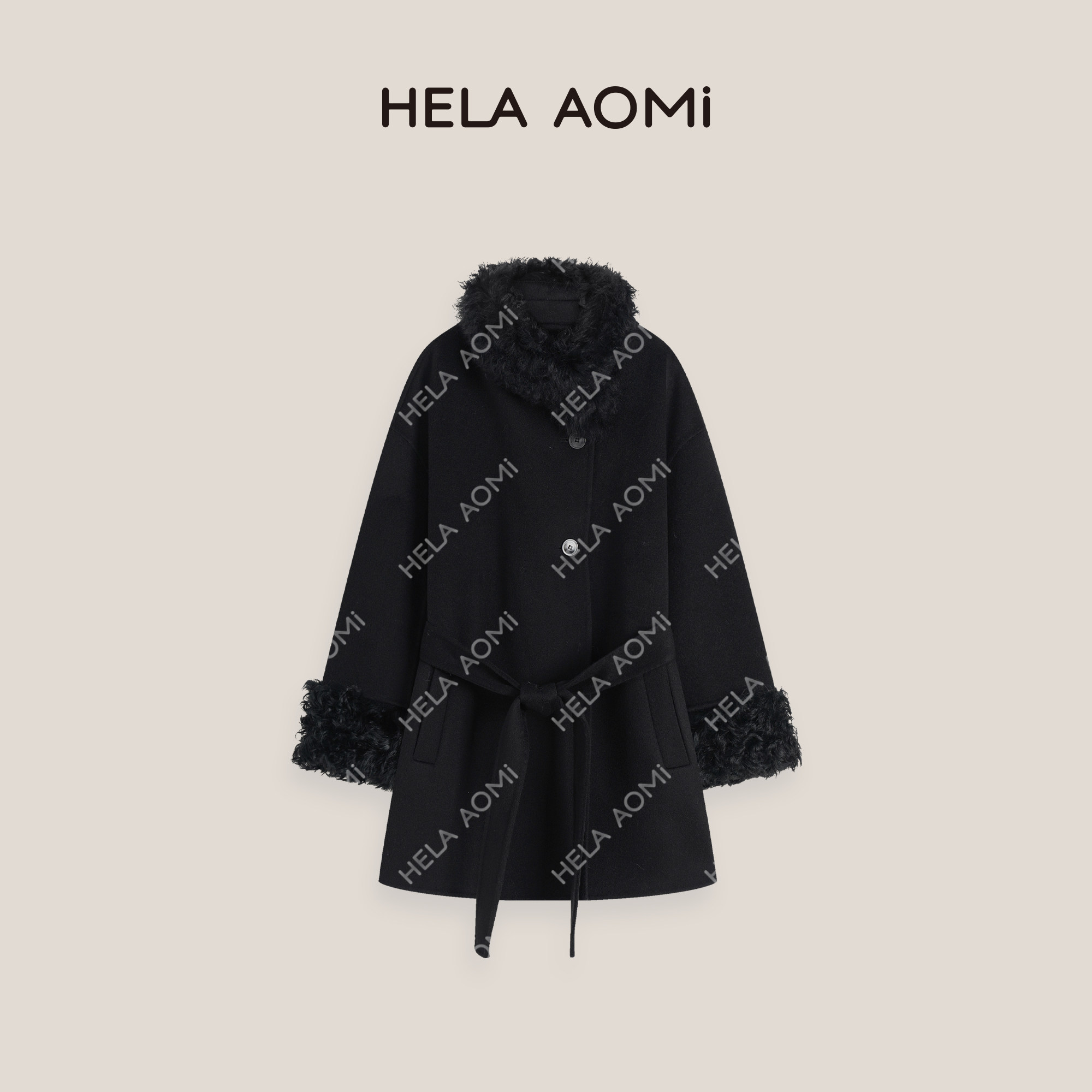 绵羊毛92.9% 邱莹莹 雾冬 AOMI 山羊绒拼接皮草大衣 HELA
