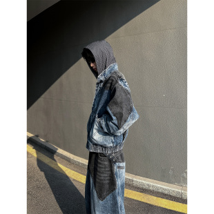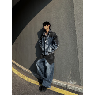 套装 THREENINE复古拼接大口袋设计牛仔外套夹克男弯刀牛仔裤 时尚