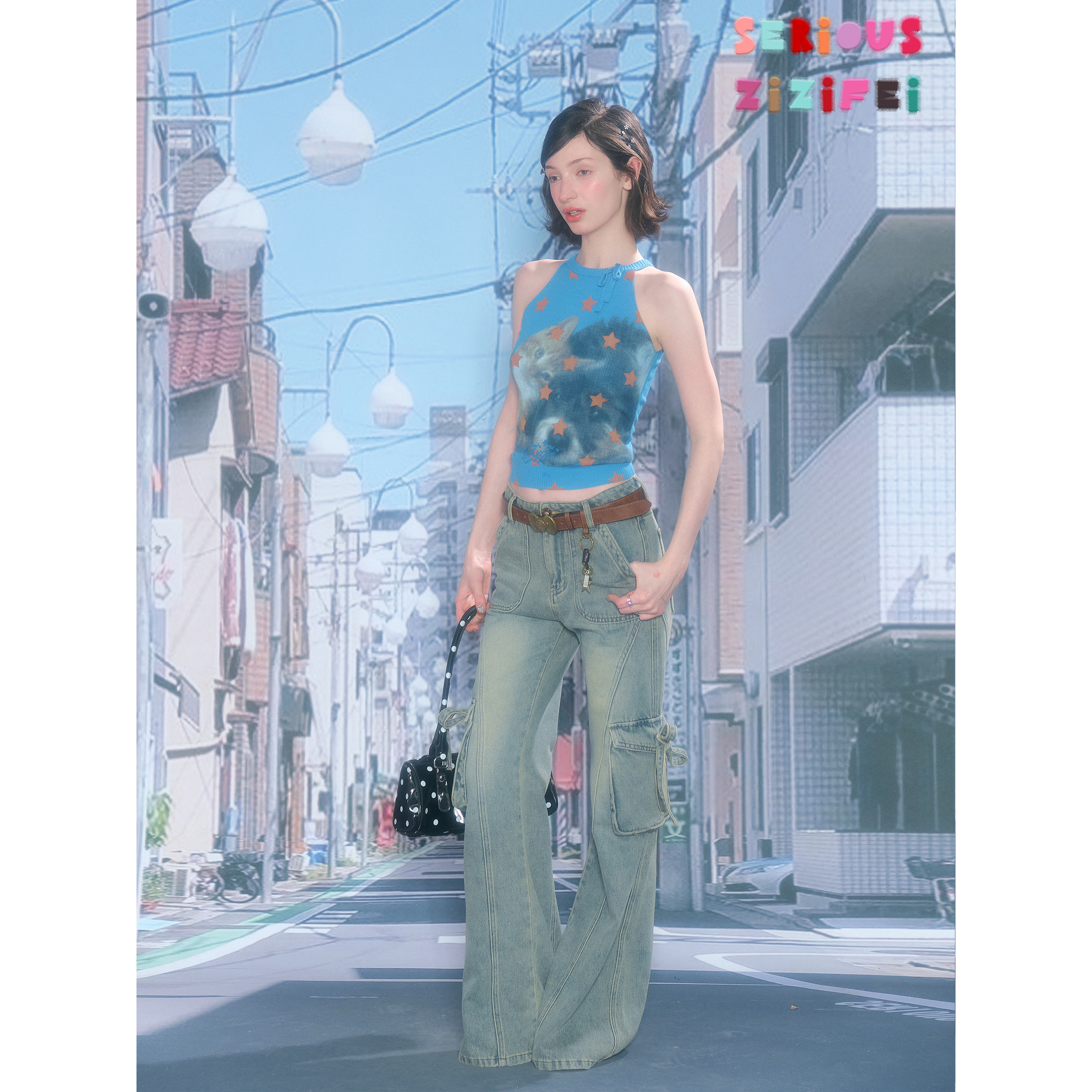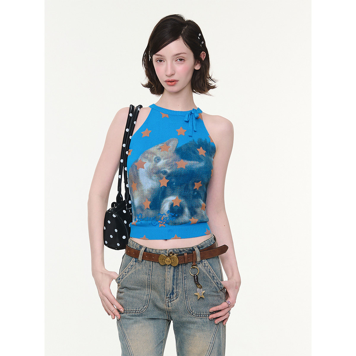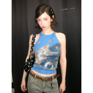 蝴蝶结星星猫咪印花显瘦蓝色针织背心女 夏季 ziziFei 甜猫捕星