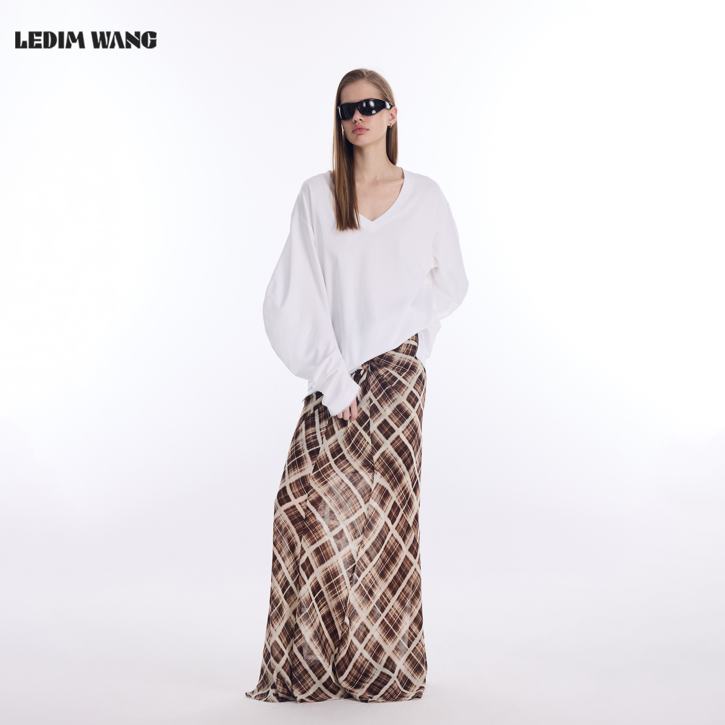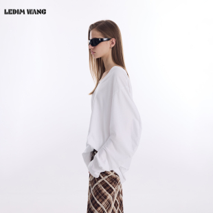白色宽松百搭长袖 LEDIM 新款 宽松T恤女2026春季 上衣 WANGV领羊腿袖