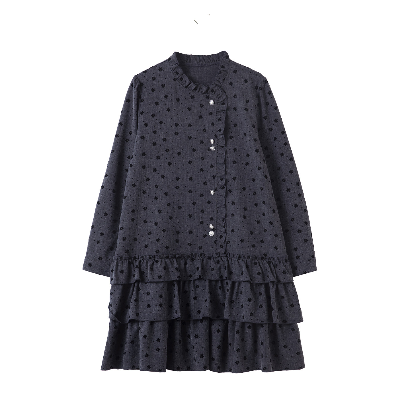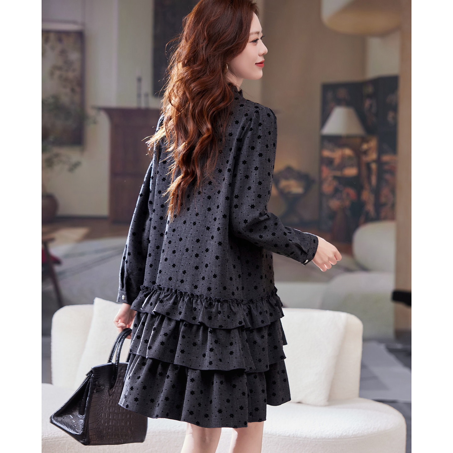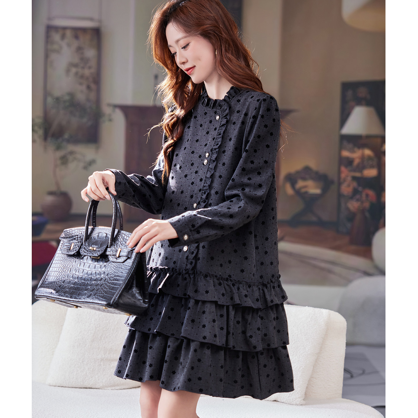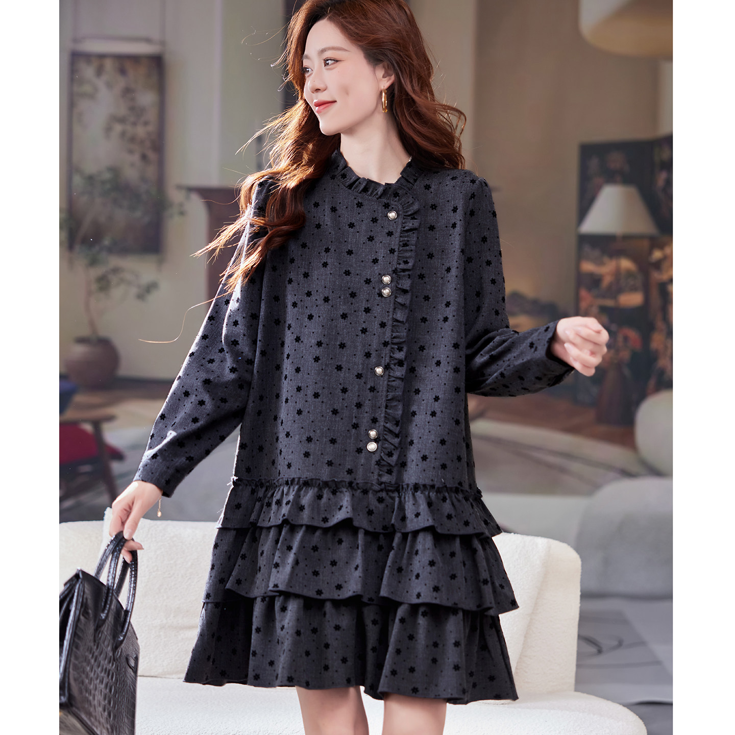 宽松休闲裙潮 韩系气质时尚 宝诗黎木耳边植绒长袖 连衣裙2026春季