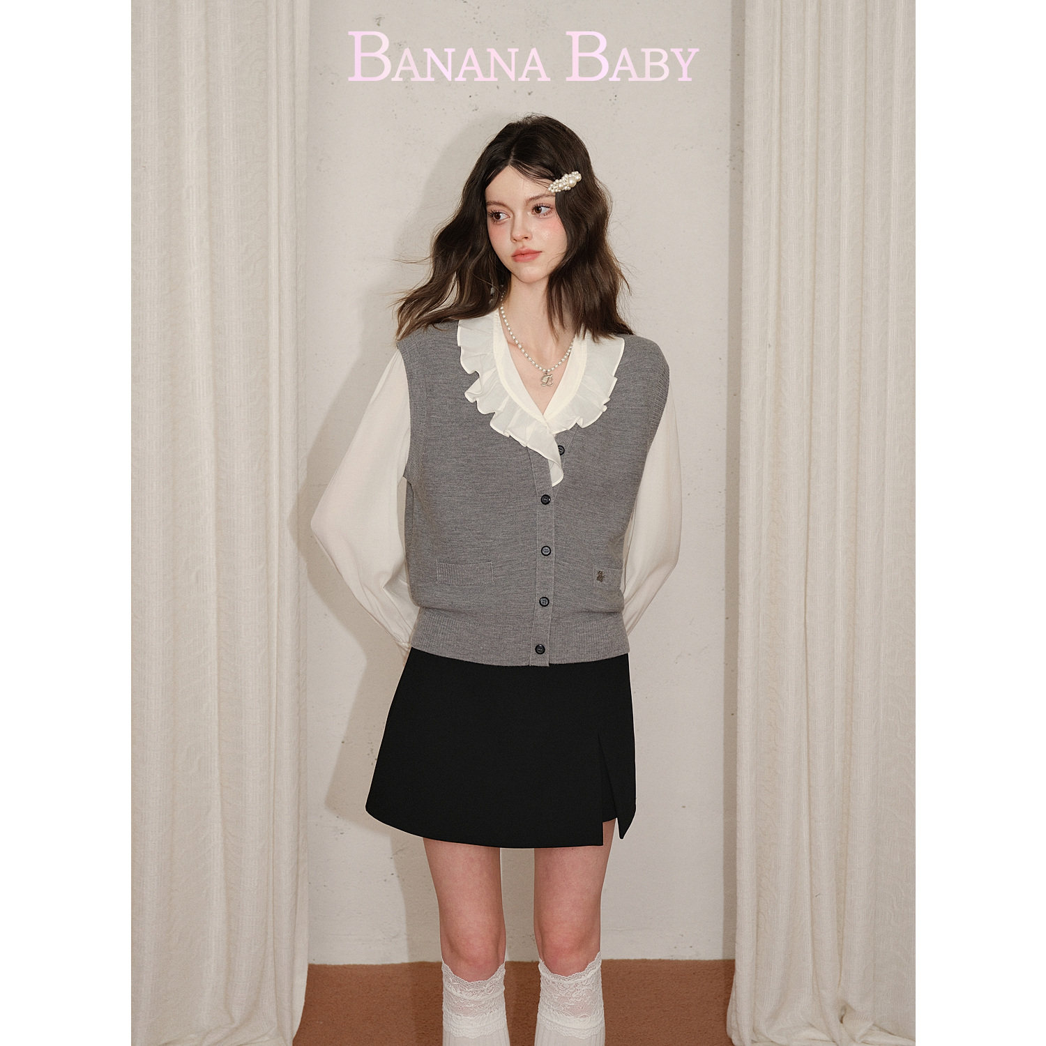 法式 新款 复古V领荷叶边灯笼袖 白衬衫 BANANA 女长袖 BABY2026年春季