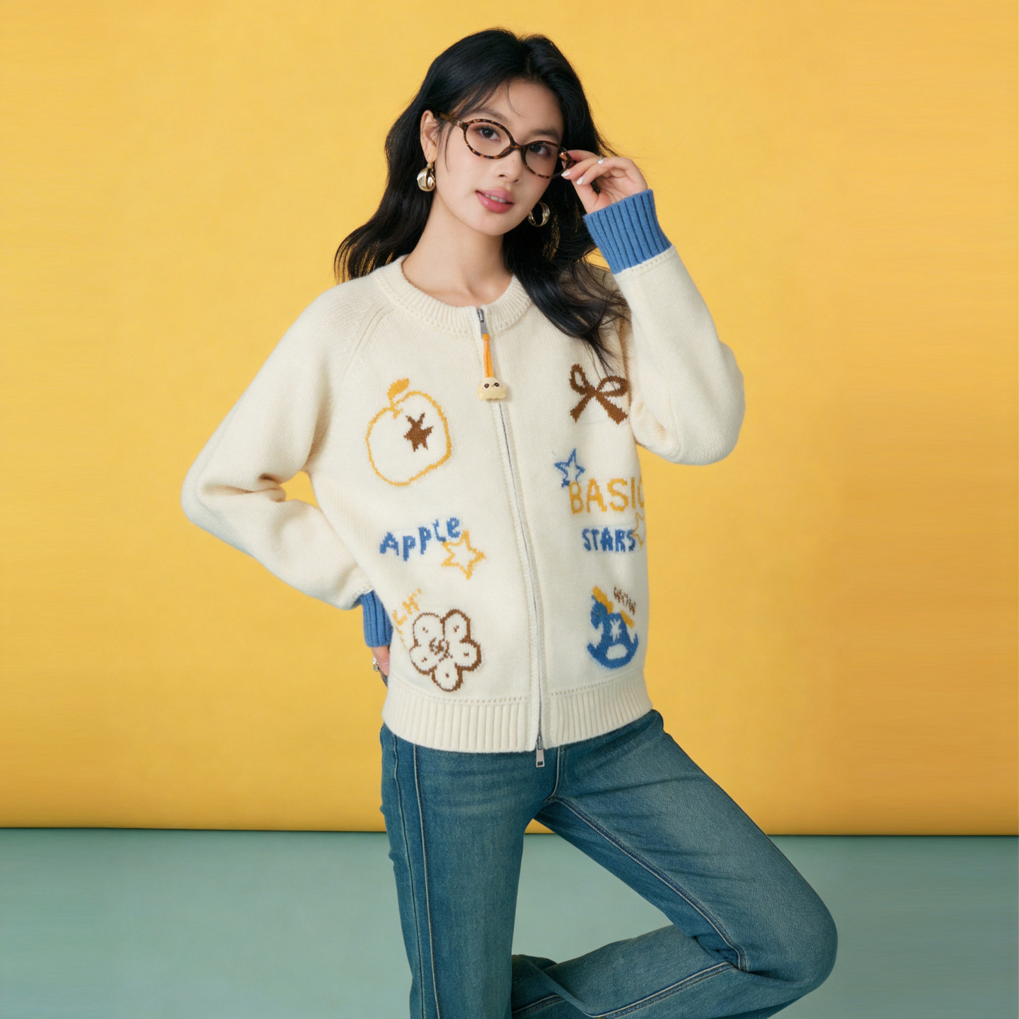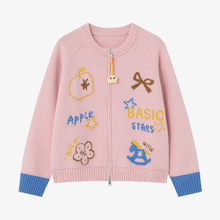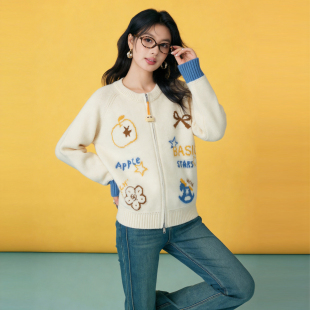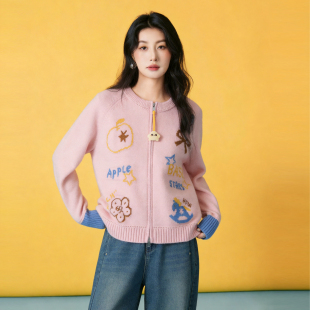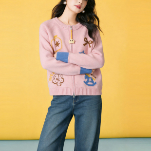 袖 Basic 2026新款 百家好卡通刺绣双拉链开衫 口拼接宽松上衣 House