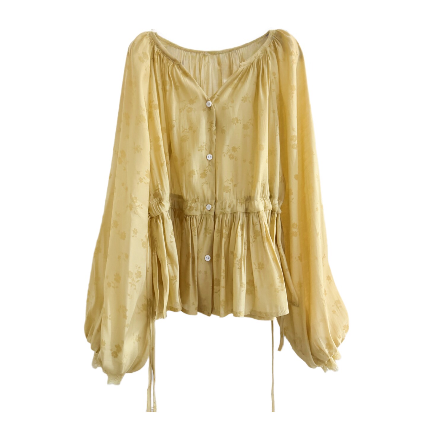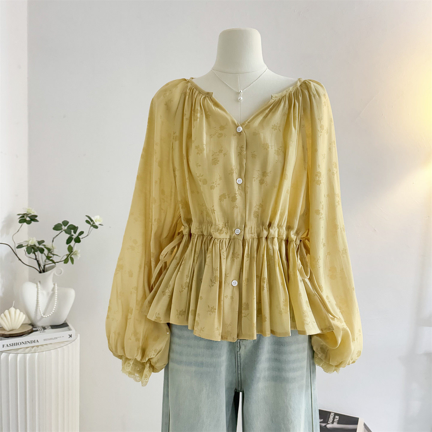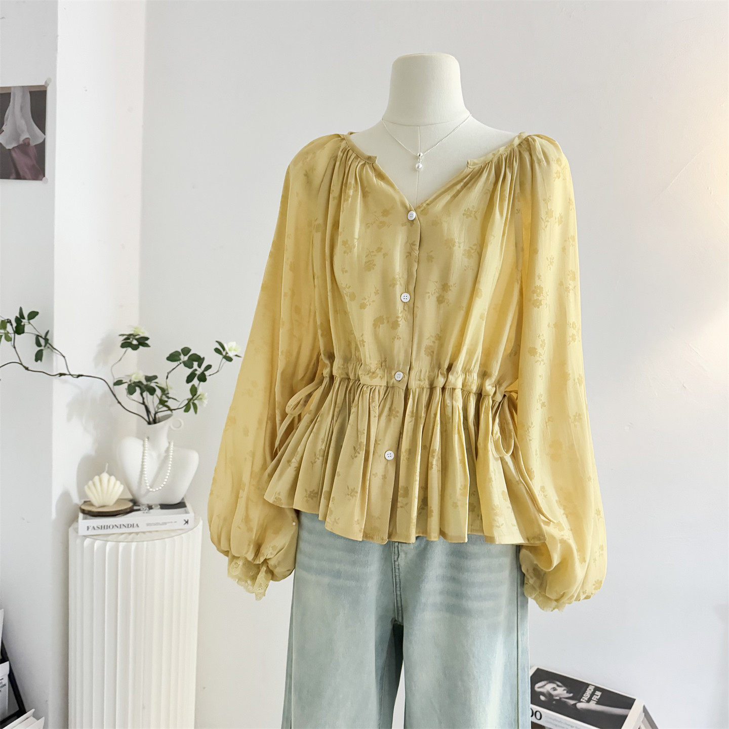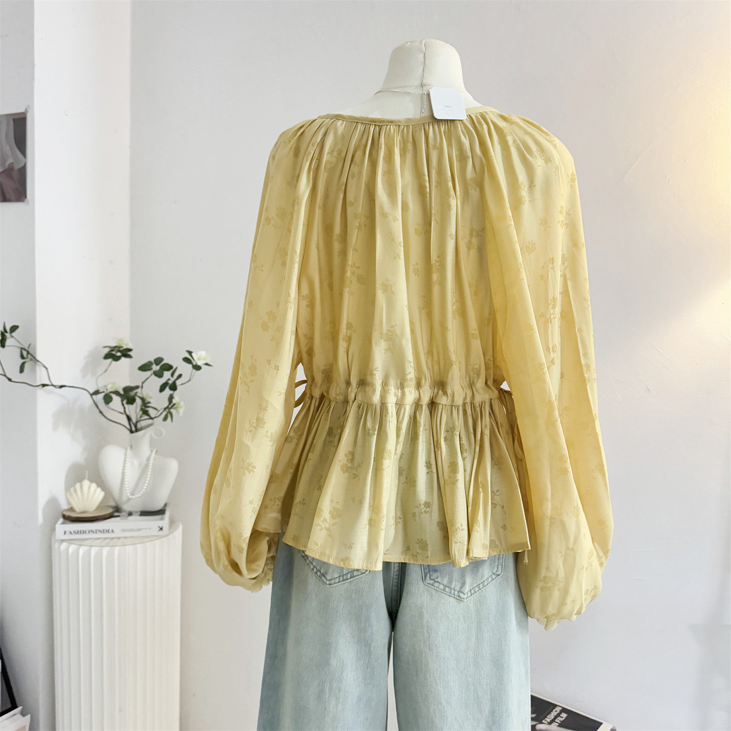 设计感抽绳收腰小衫 暗纹印花法式 女2026春季 衬衫 上衣 V领灯笼长袖