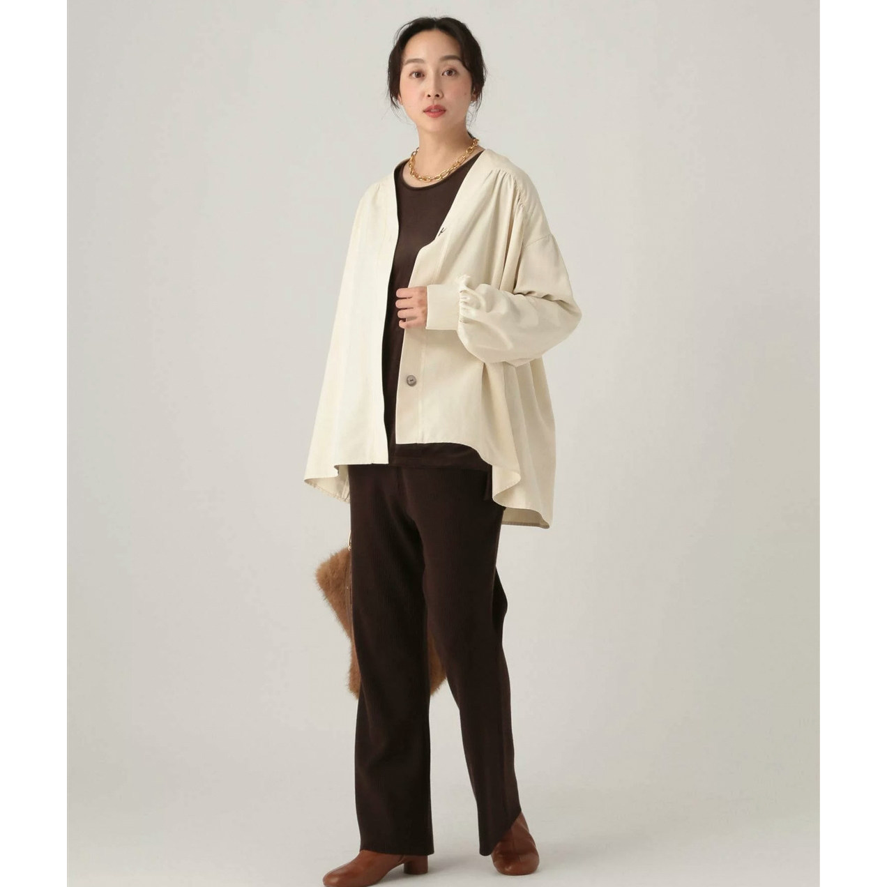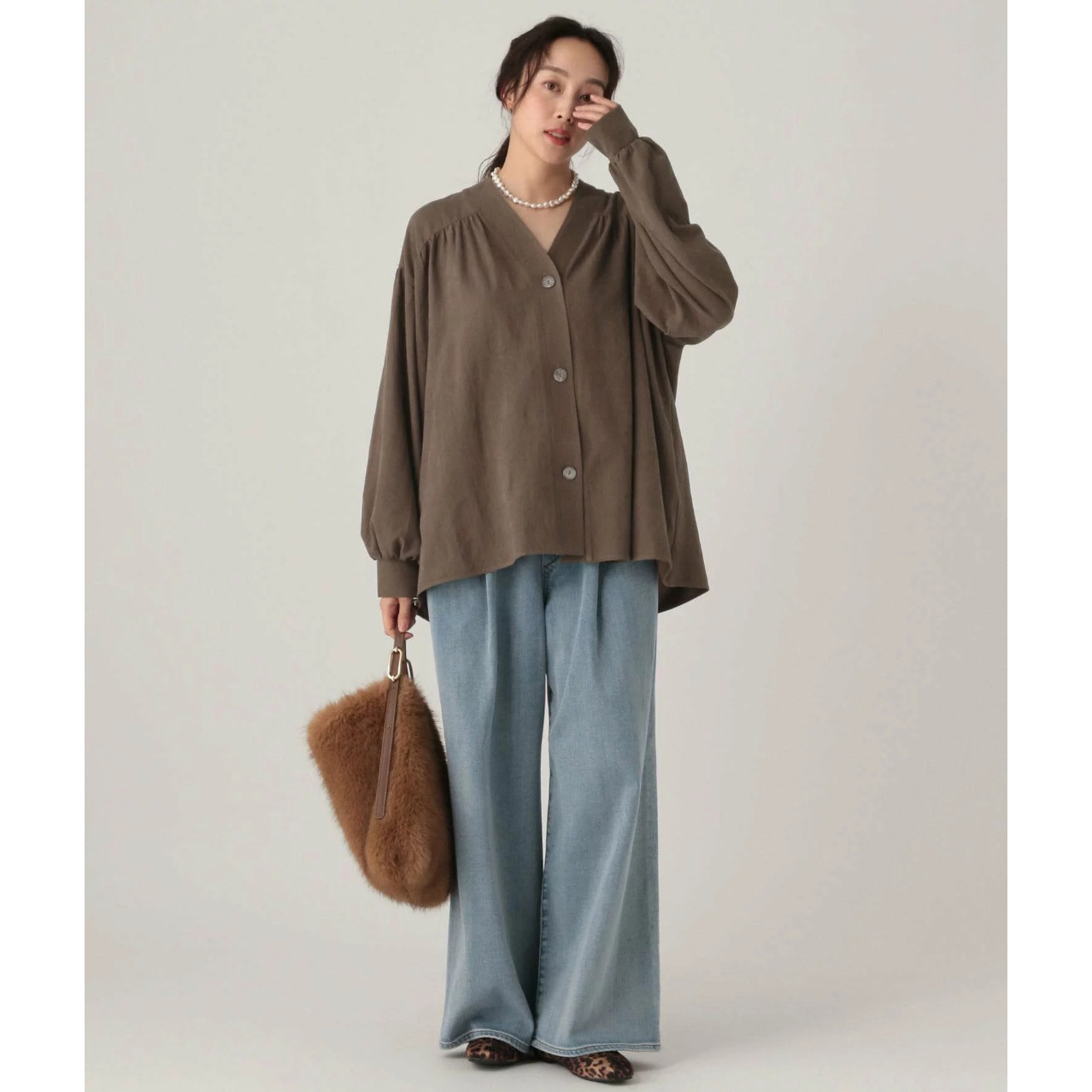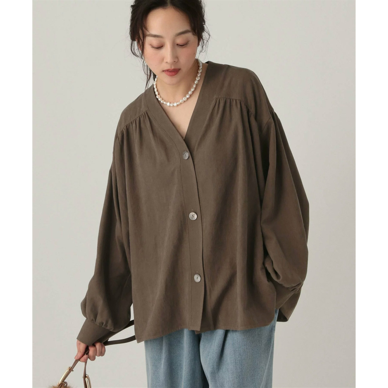 开衫 日单品牌春秋新款 衬衫 百搭两穿v领系扣磨毛长袖 外套32145 时尚