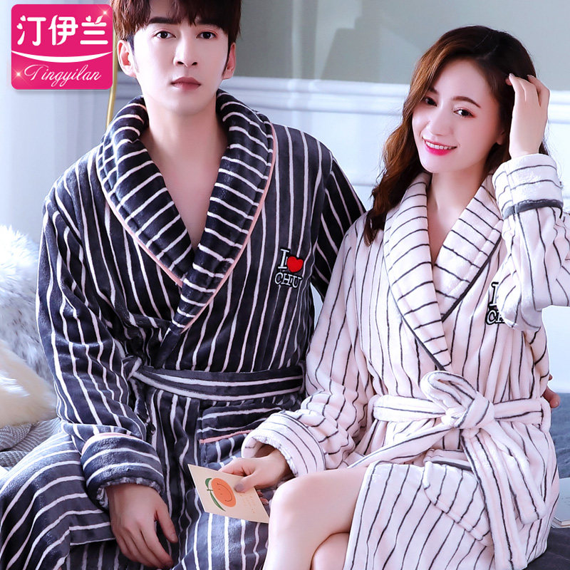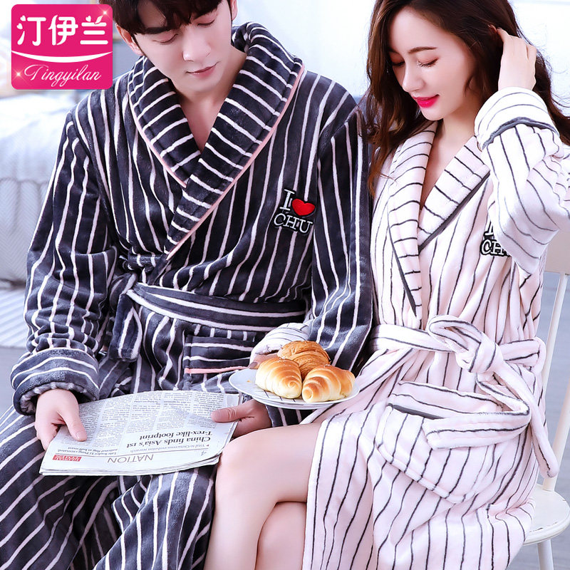 条纹爱心情侣睡袍休闲加厚法兰绒浴袍珊瑚绒O男女浴衣加长睡衣秋