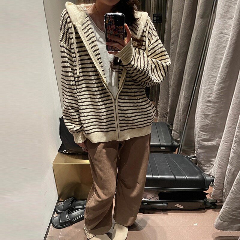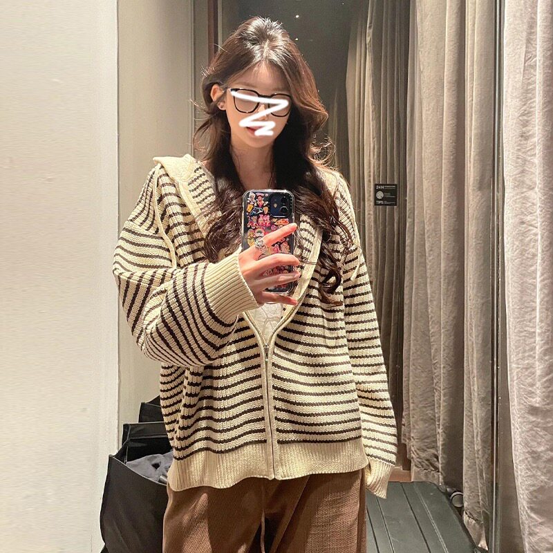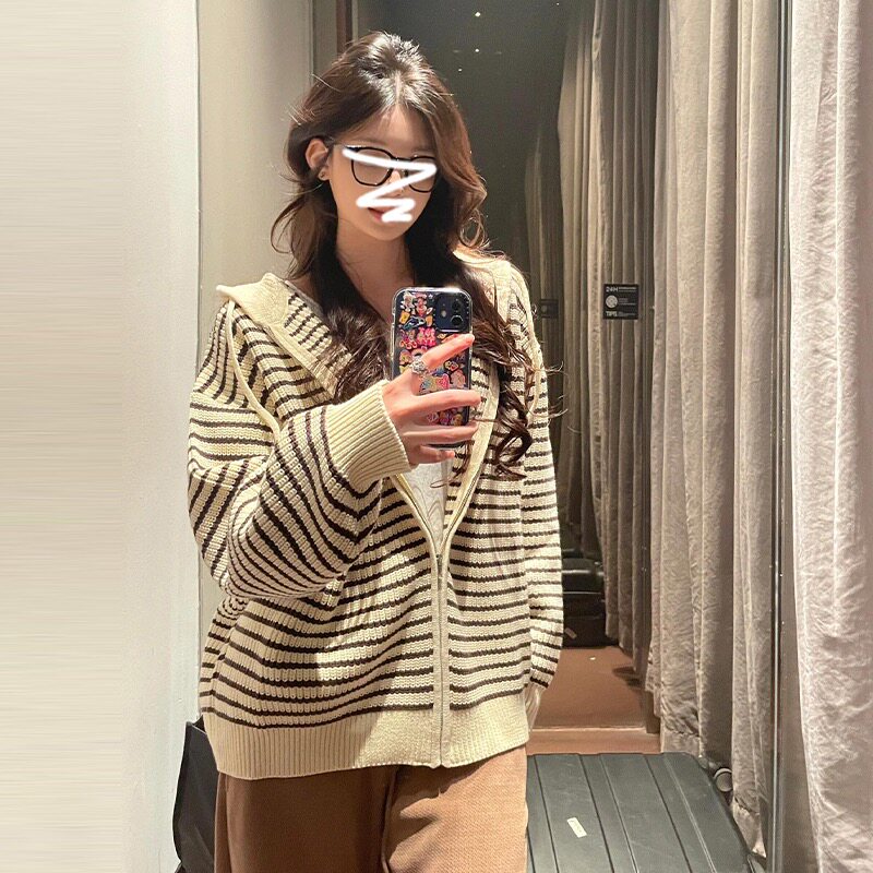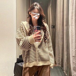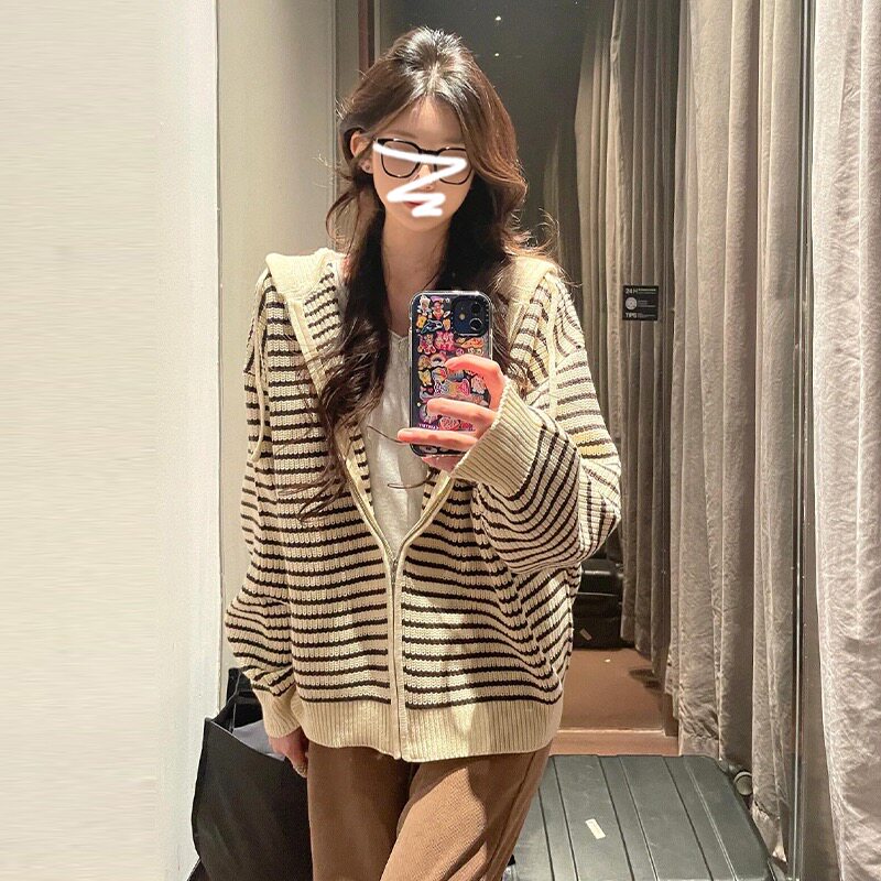 韩系慵懒风撞色新款 宽松条纹连帽针织开衫