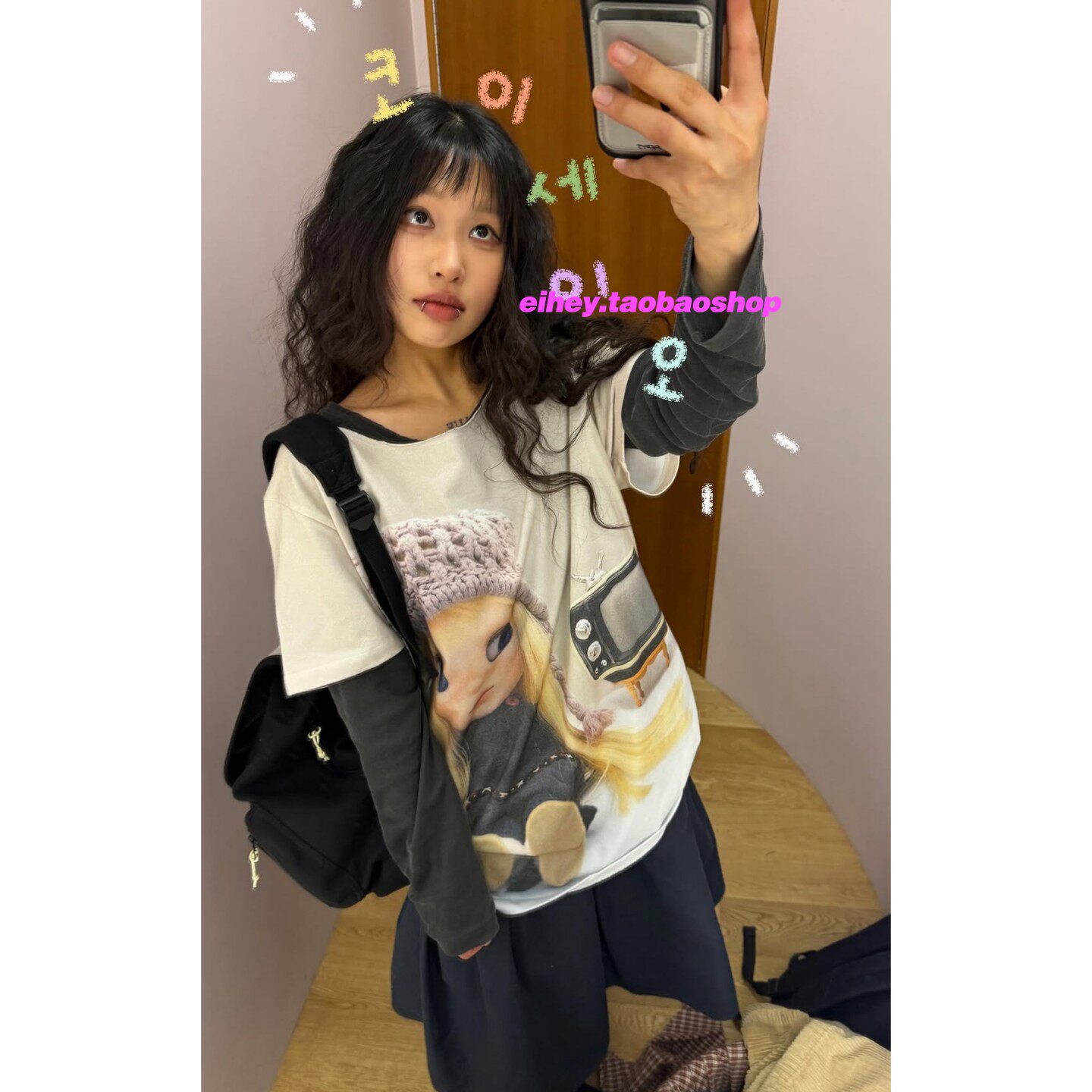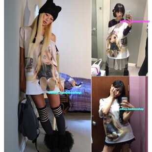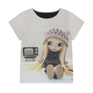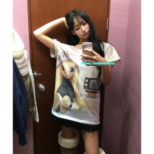 eihey诶嘿2026春夏新款 T恤上衣女 宽松显瘦斜肩卡通娃娃印花短袖
