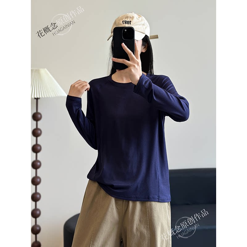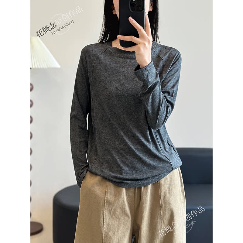 上衣 百搭显瘦时尚 花概念韩系极简风长袖 T恤女纯色圆领打底衫