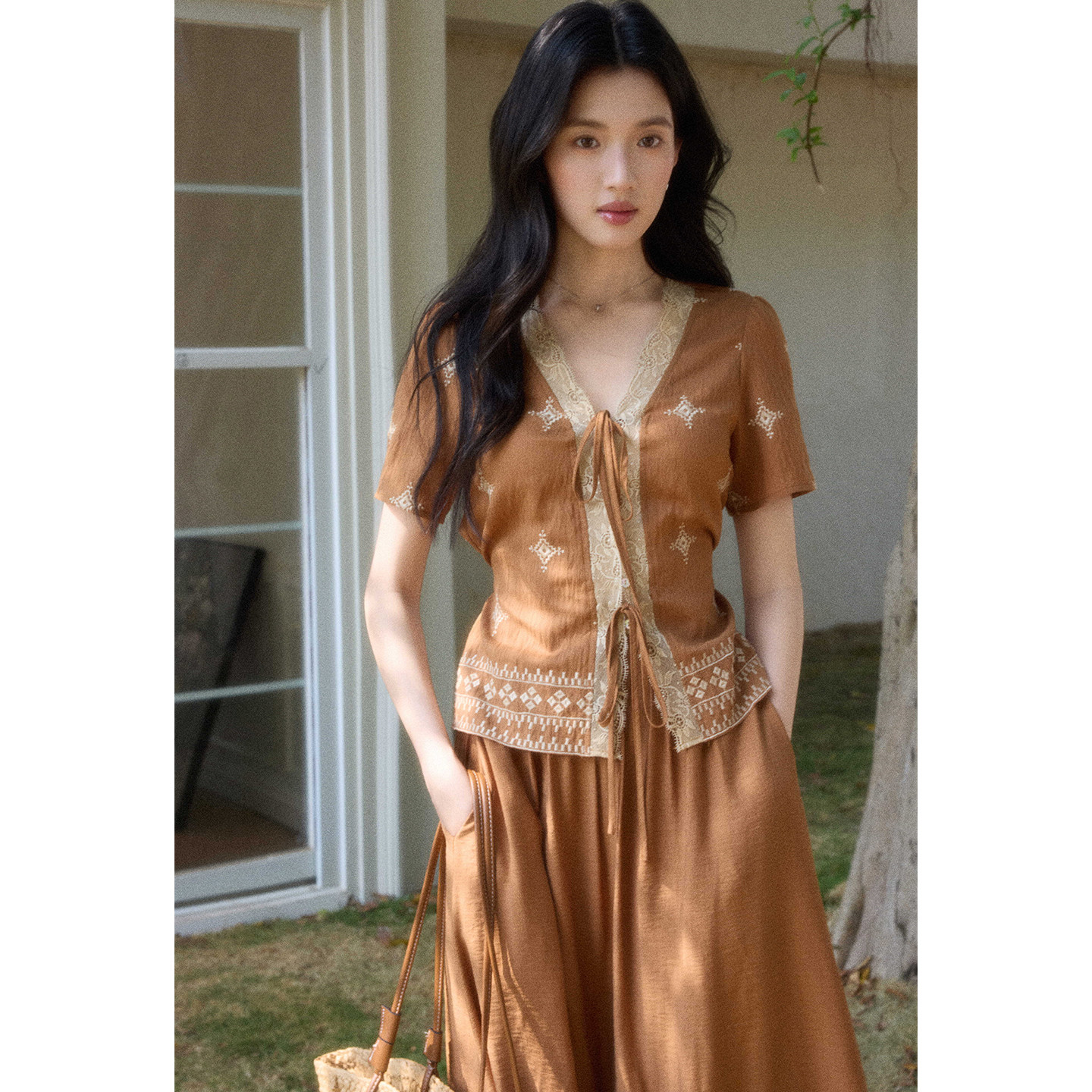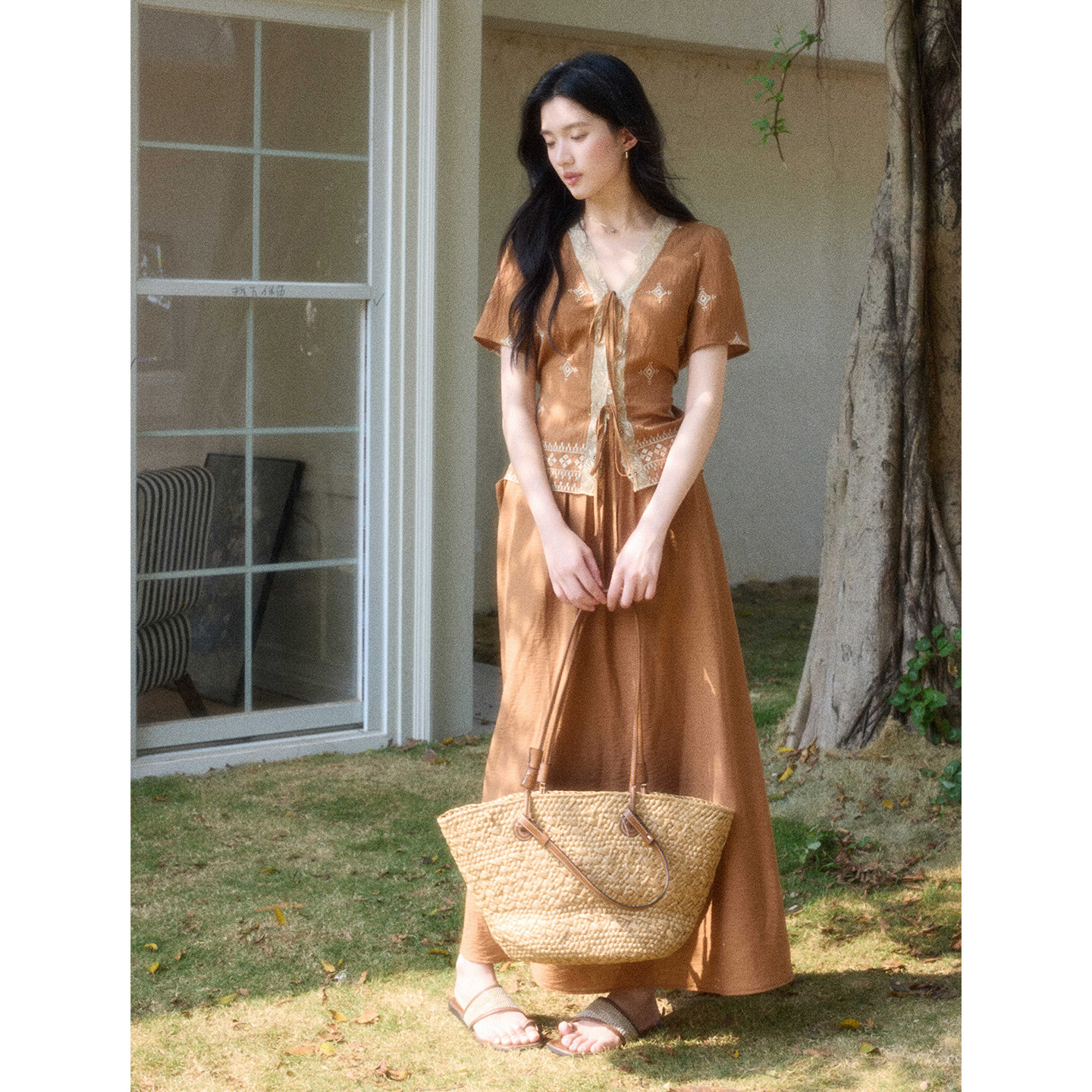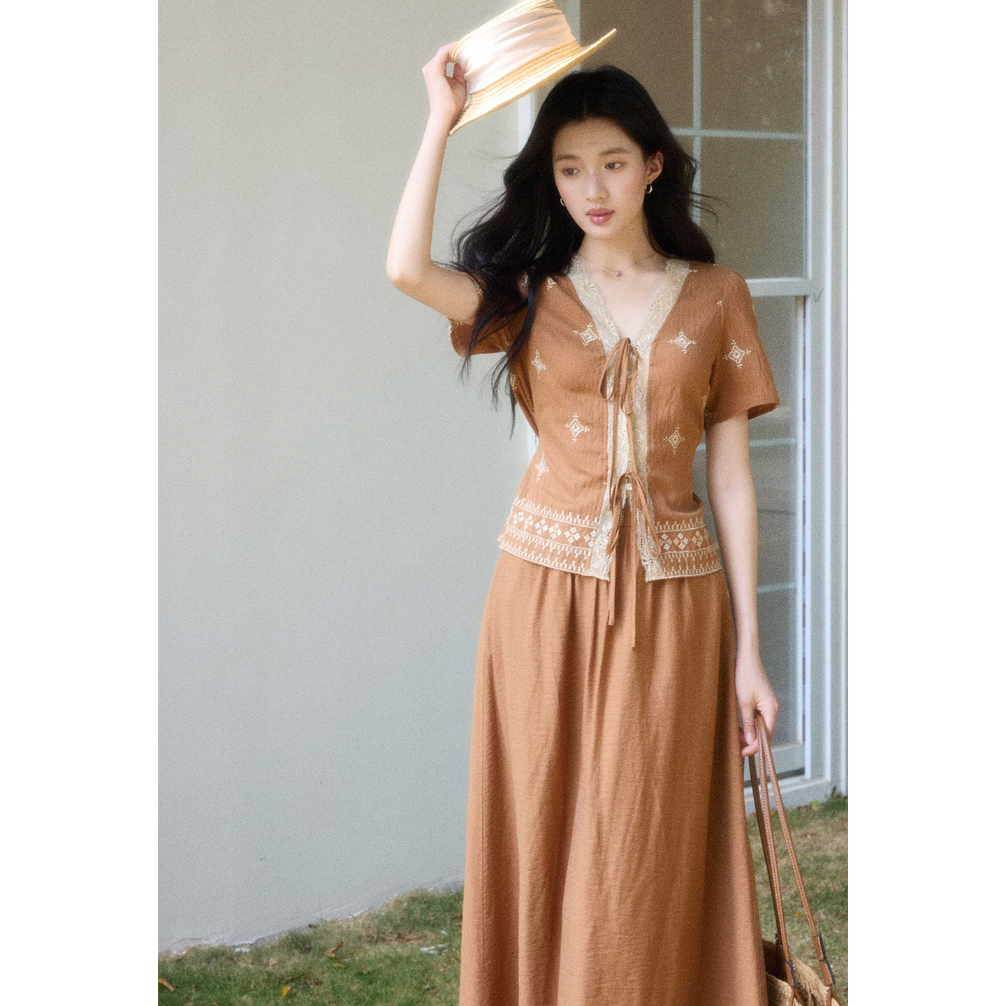 高腰长裙套装 贰羊设计 衬衫 度假波西米亚风立体绣花短袖 余意