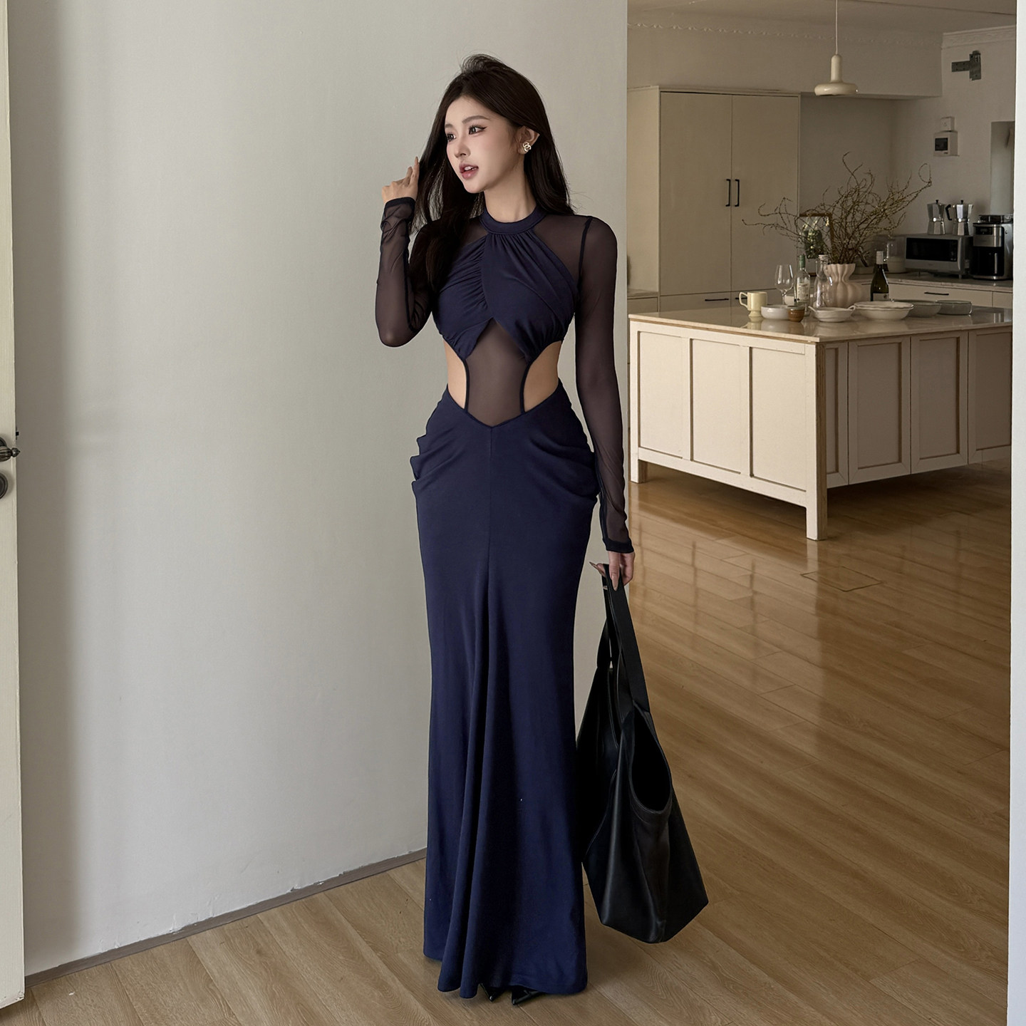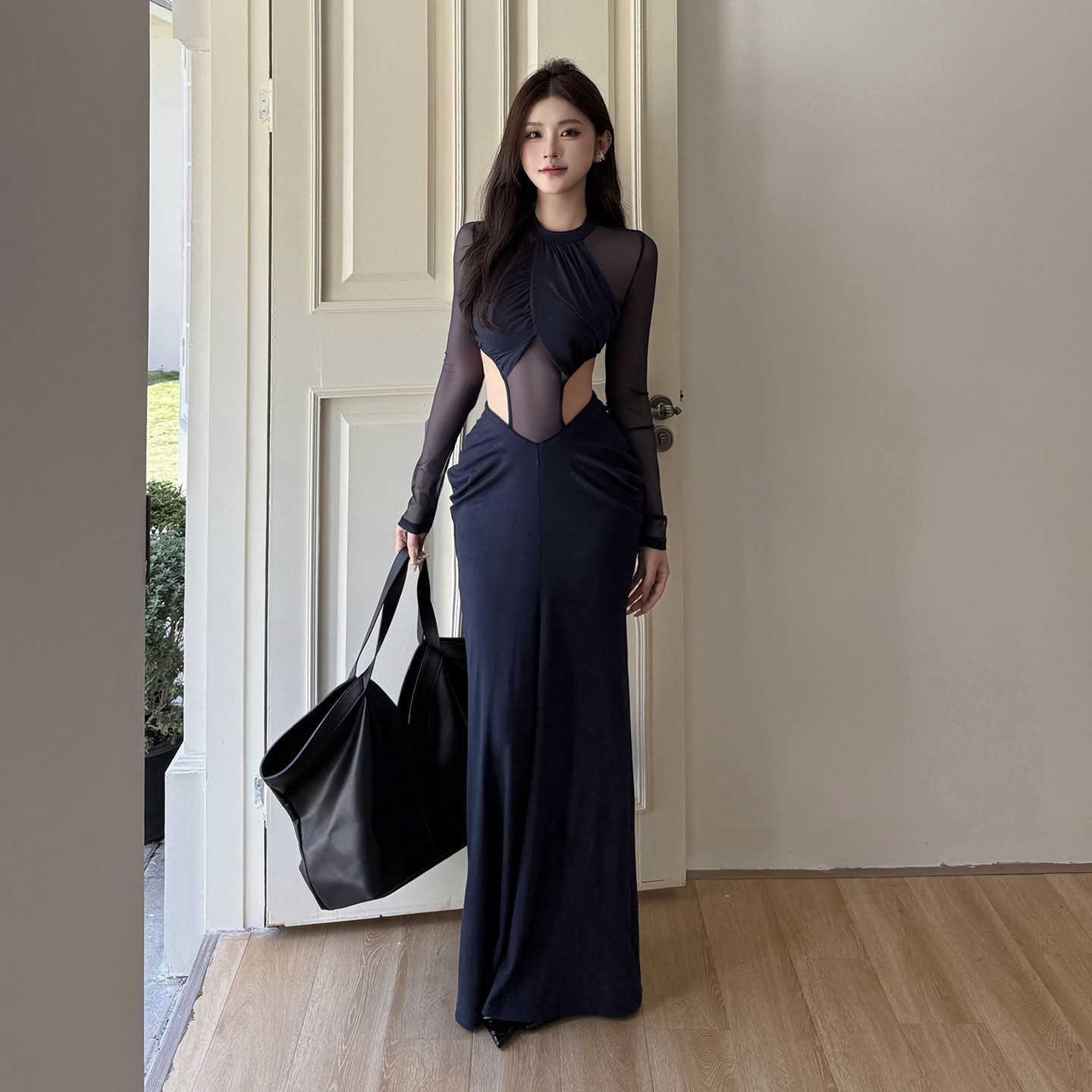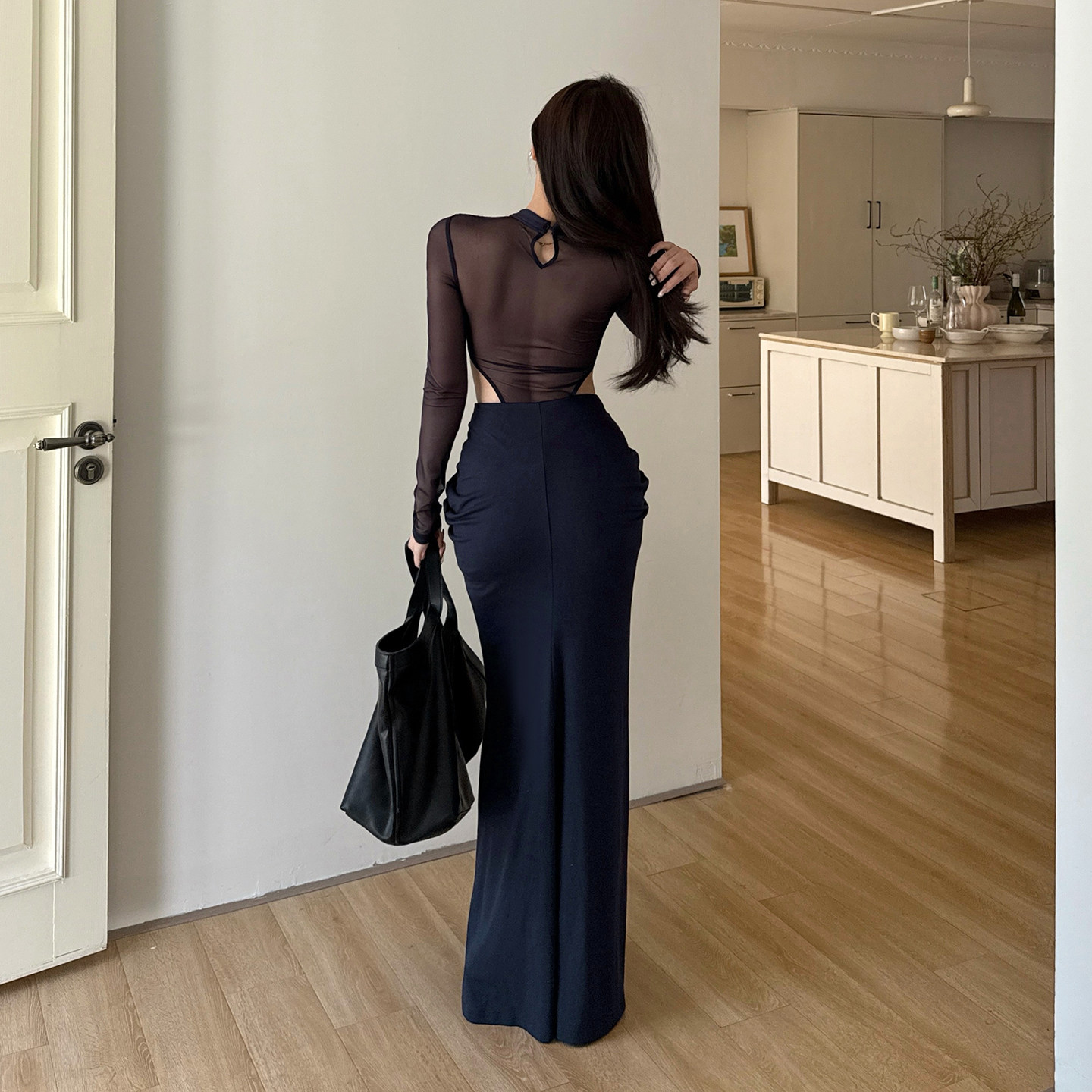 修身 新款 显瘦气质包臀长裙 性感网纱拼接镂空连衣裙春季 GirlsAt18