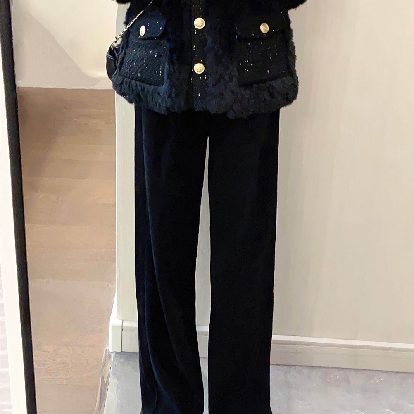 黑色雪尼尔休闲裤 女秋冬加绒胖妹妹mm高腰宽松显瘦灯芯绒阔腿长裤
