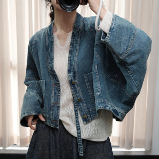 短外套女 休闲牛仔开衫 古与色秋冬文艺复古宽松显瘦蝙蝠袖 系带个性