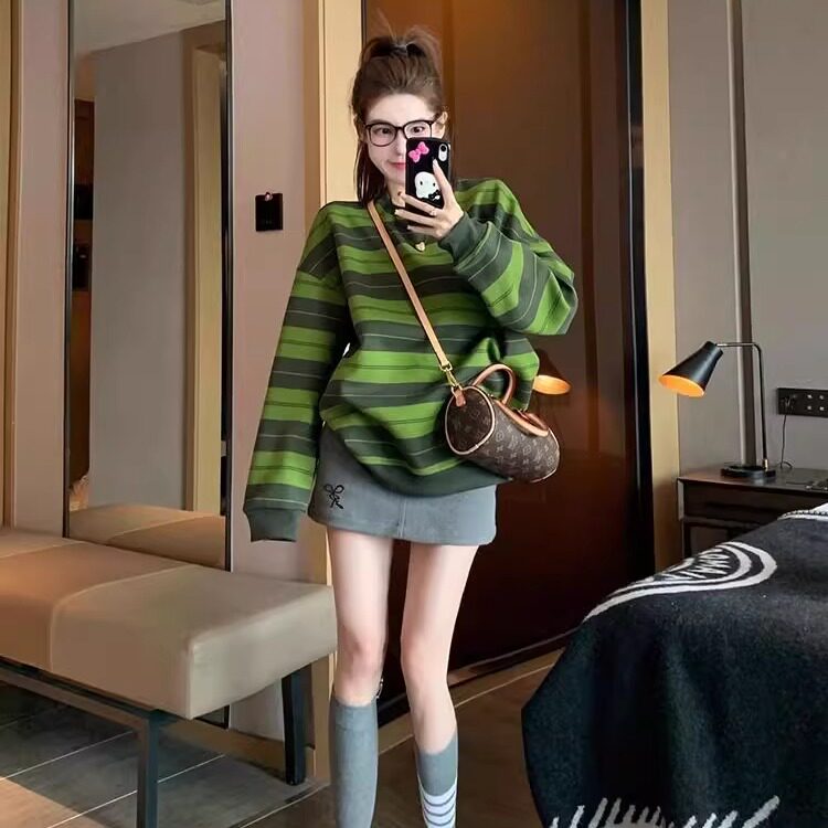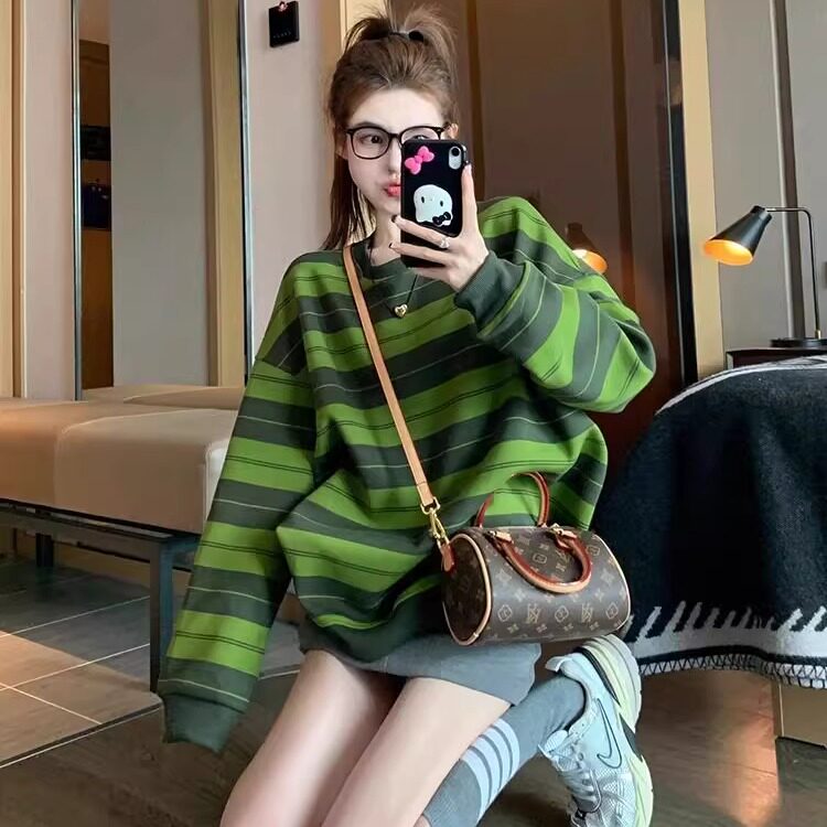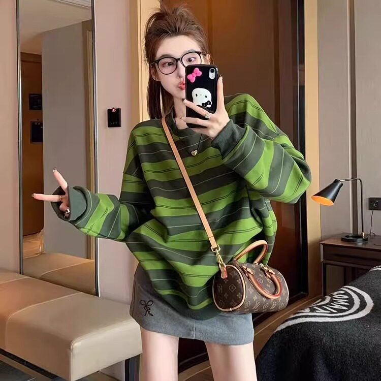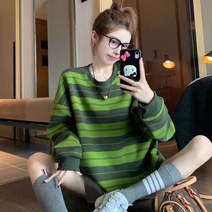 新款 大码 条纹卫衣女春秋季 时尚 胖MM宽松显瘦慵懒风上衣300斤 美式