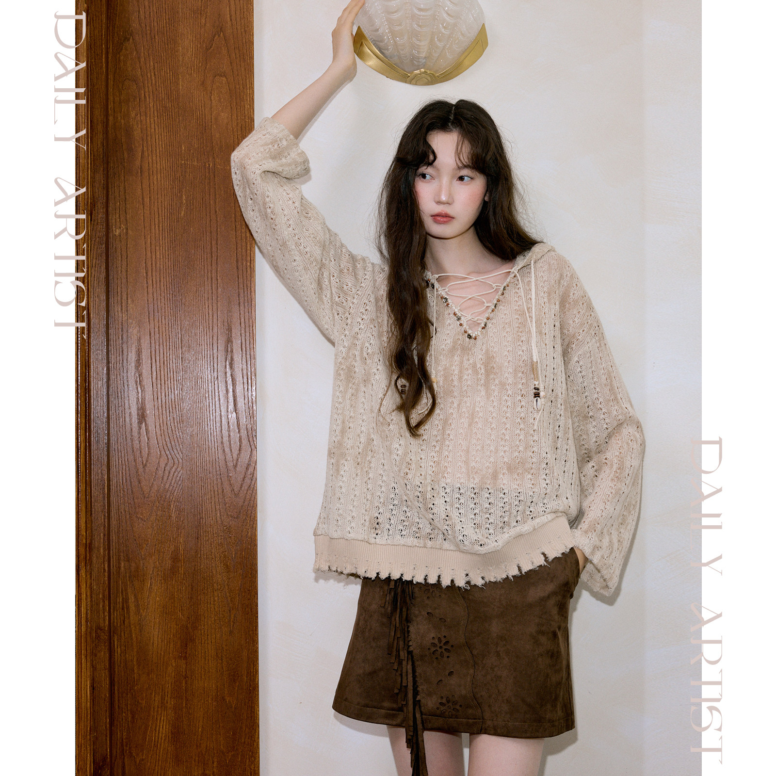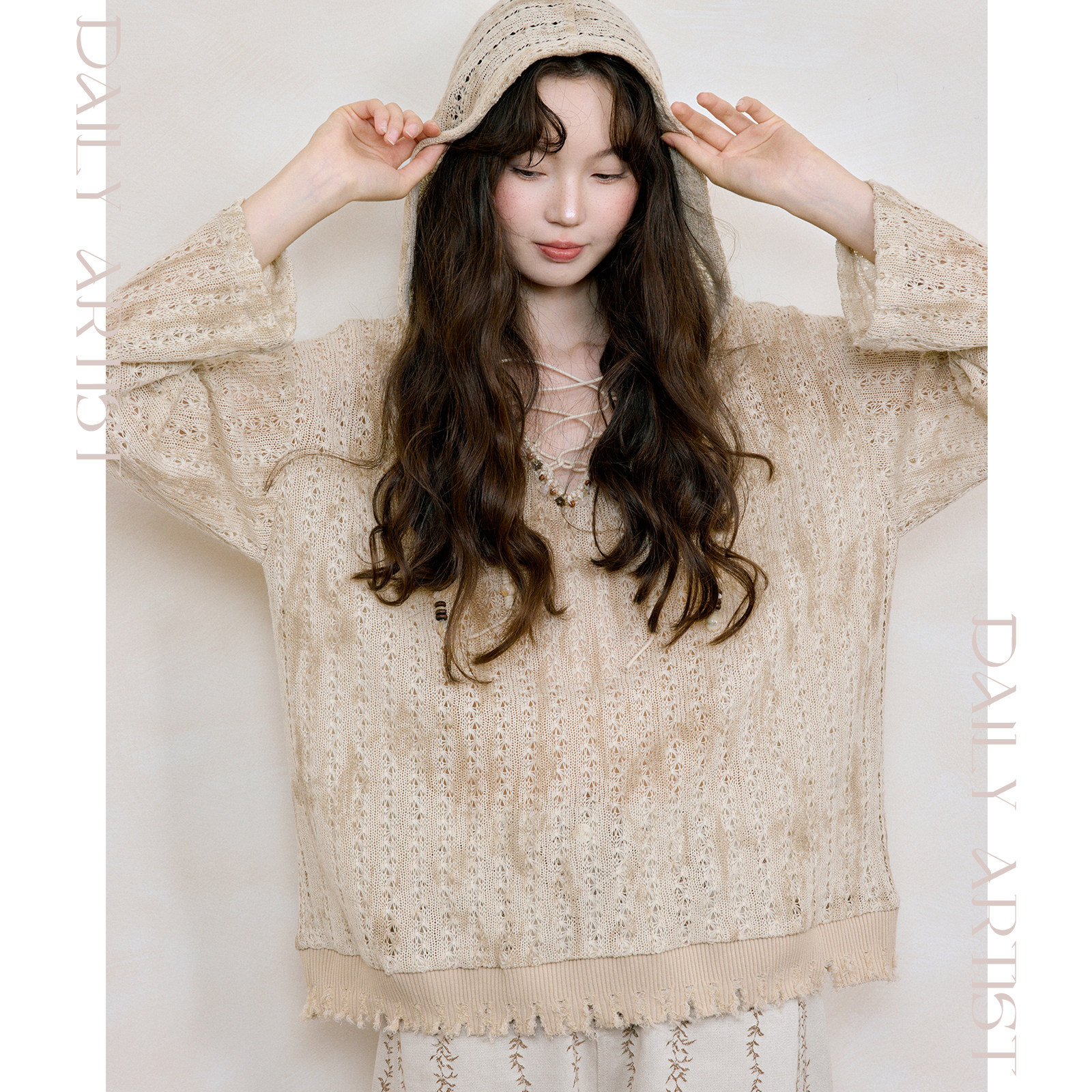 今日艺术家原创浅棕色新波西米亚风宽松镂空连帽罩衫 上衣