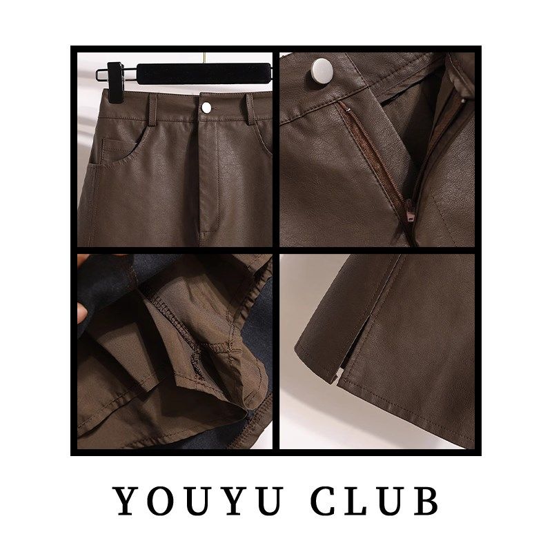 咖啡色短裙高腰遮跨A字包臀大码 胖mm小皮裙秋季 半身裙女2024新款