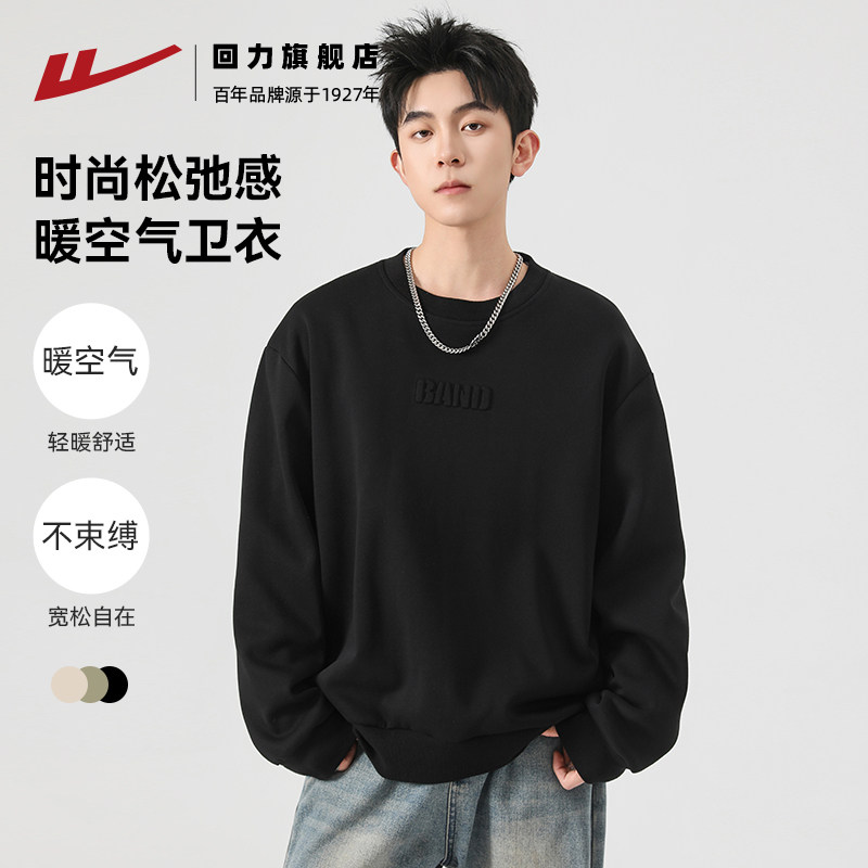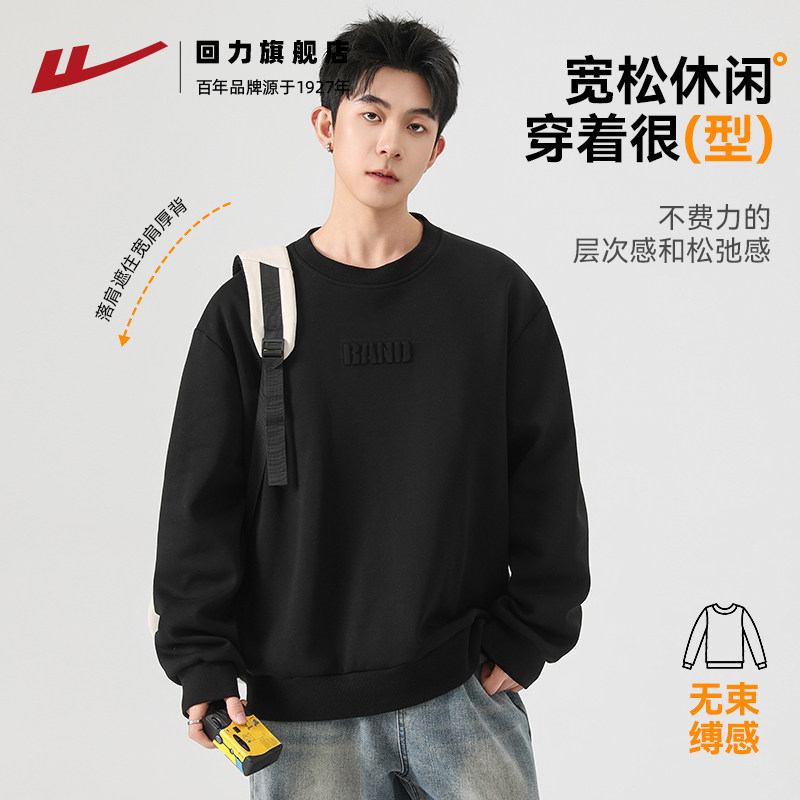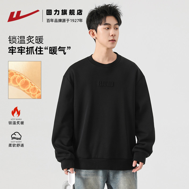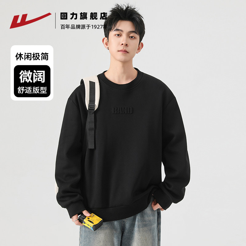 男士 圆领套头衫 棉质上衣 宽松长袖 回力黑色加绒卫衣男2025秋冬新款