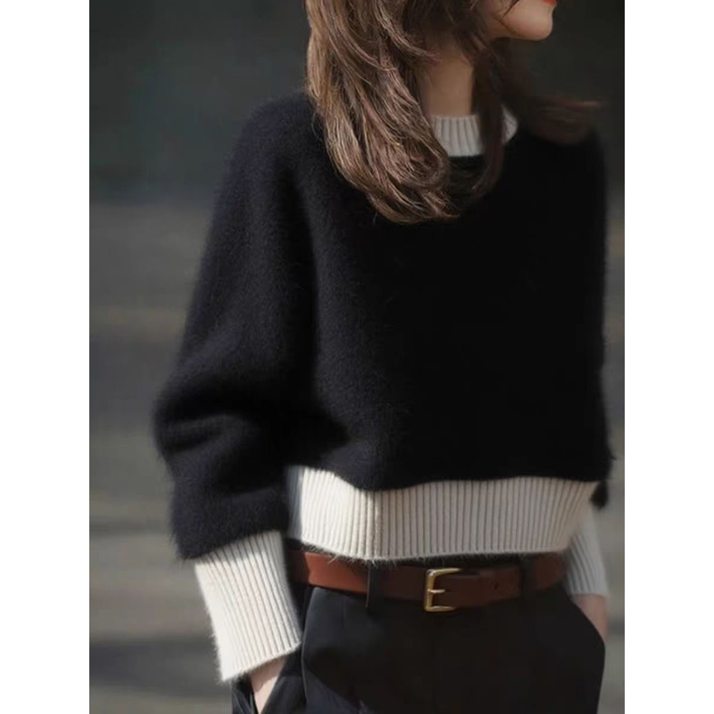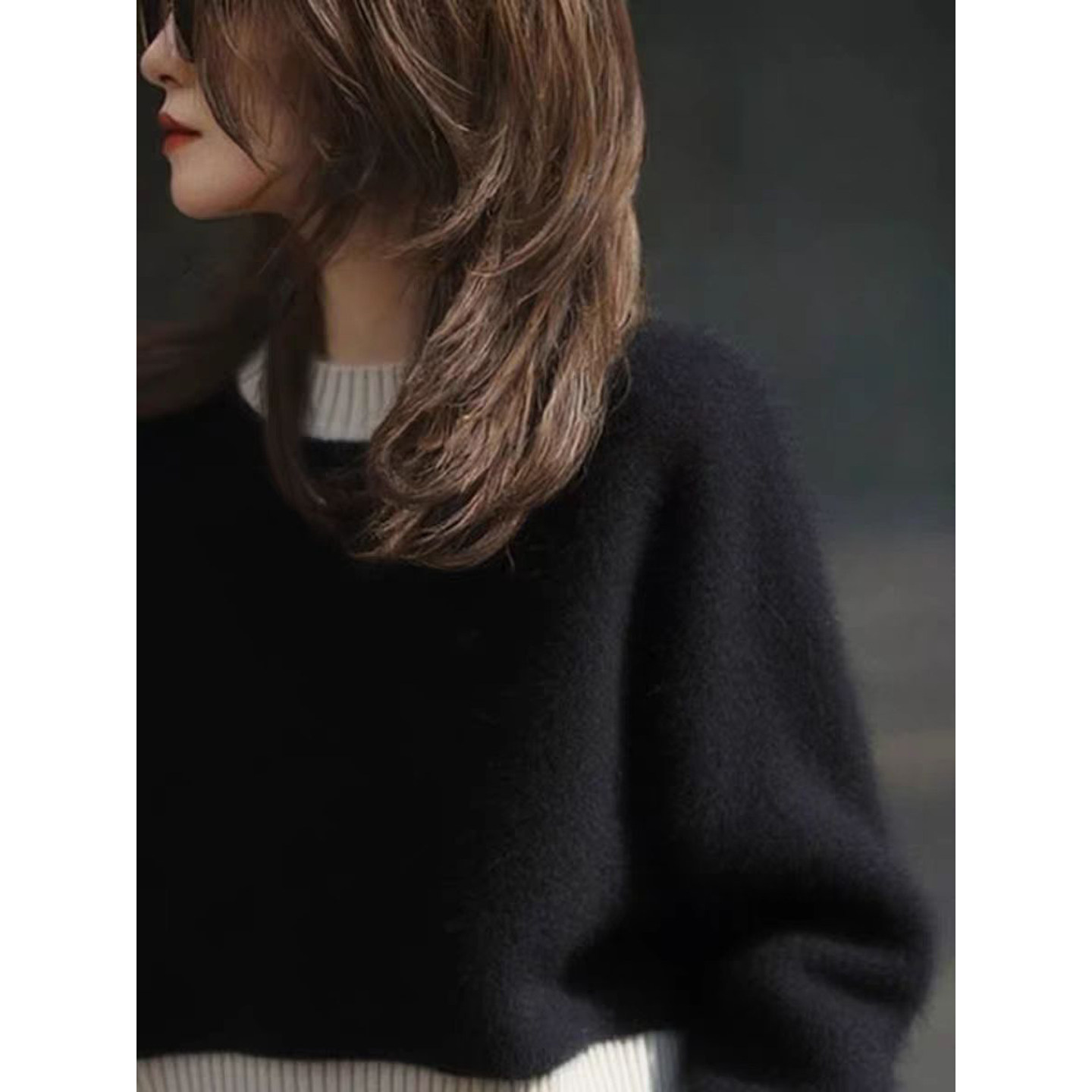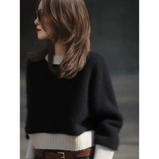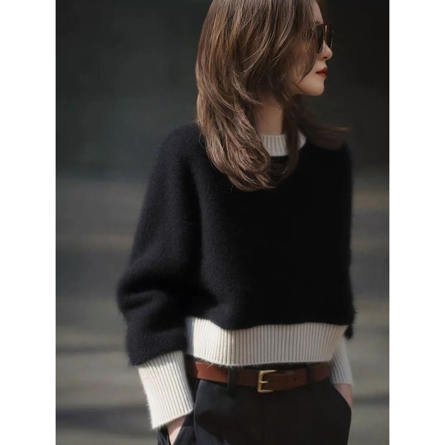 新款 不规则大翻领露肩混色慵懒毛衣秋季 上衣女 慵懒美学 GV大白哥