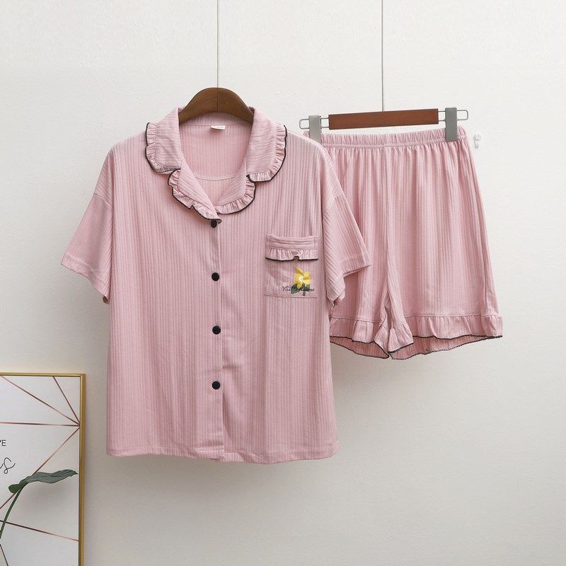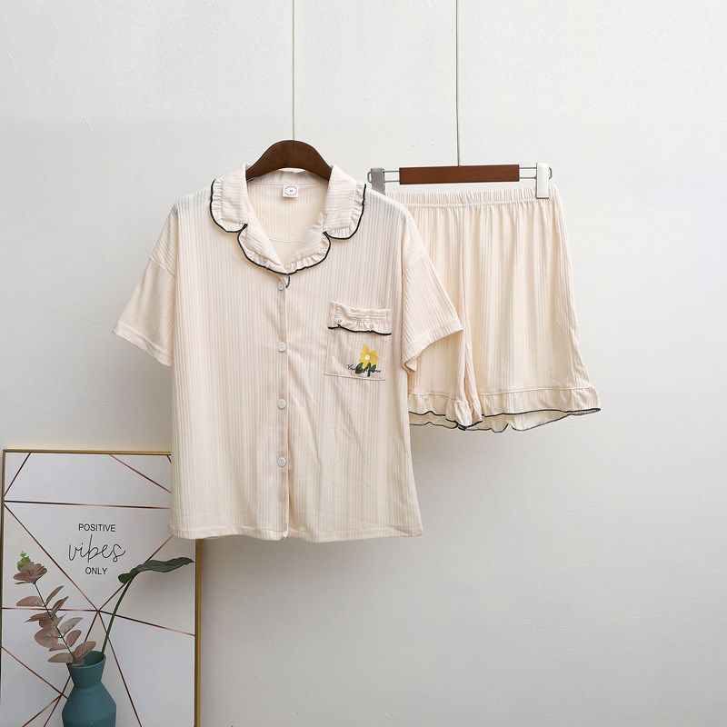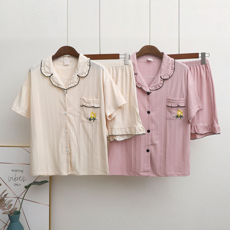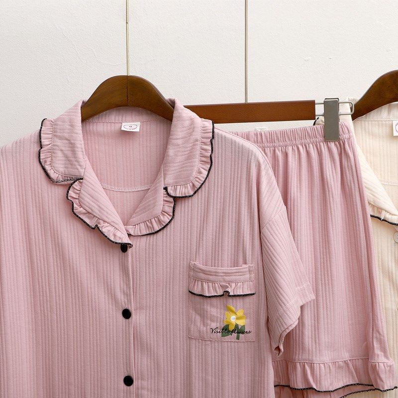 短裤 2024夏季 女士棉短袖 花瓣领可爱休闲家居睡衣套装 宽松 短袖
