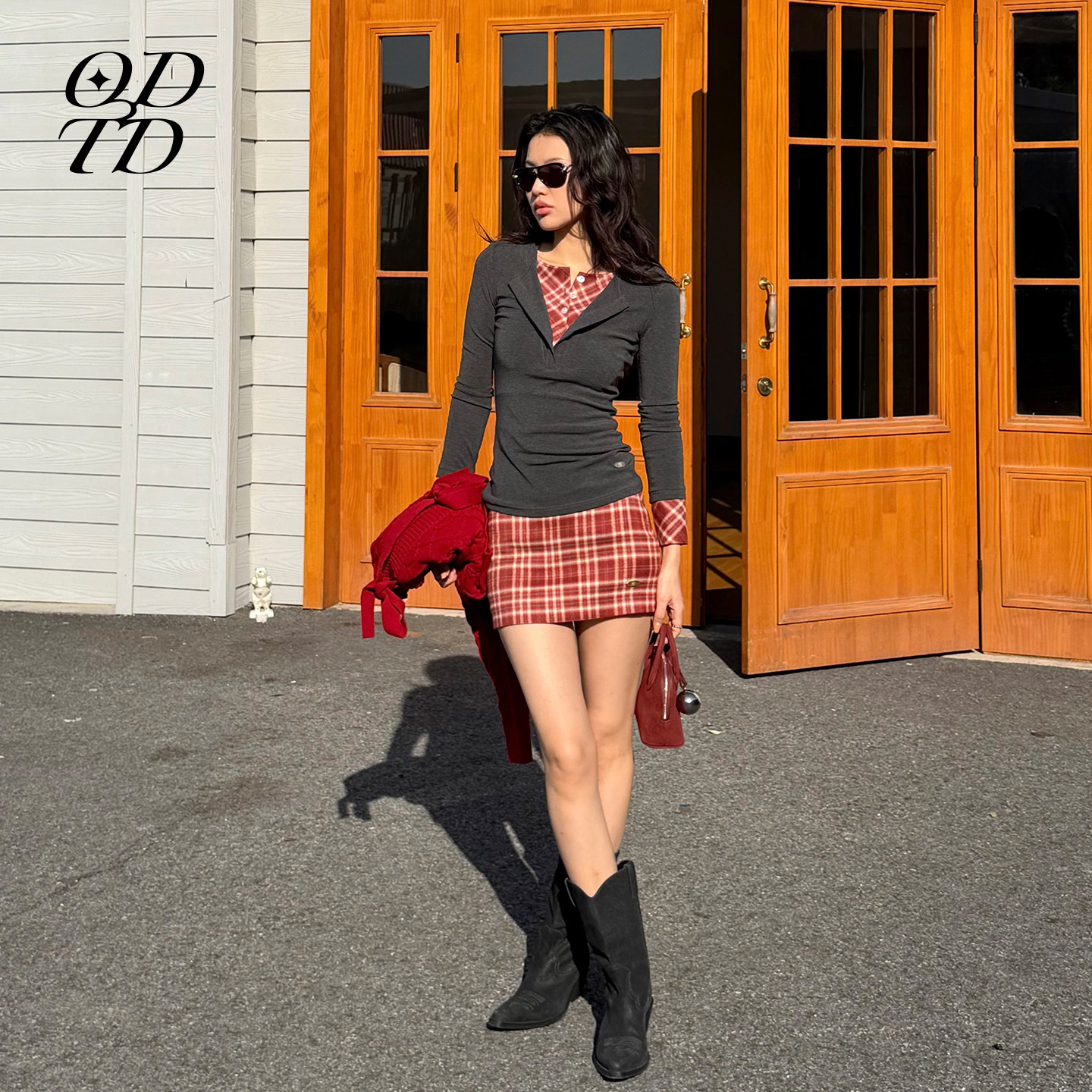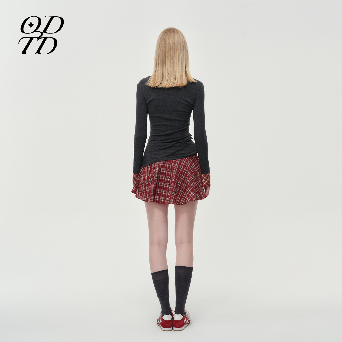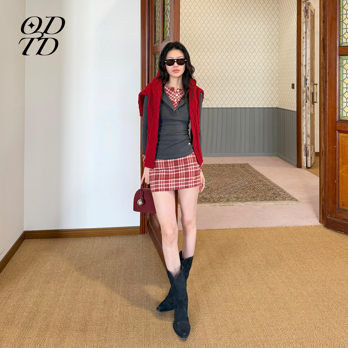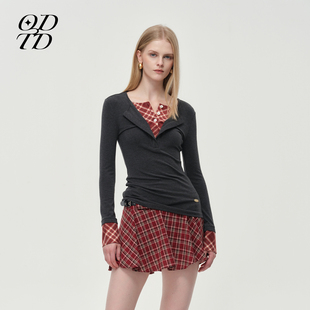 胶囊新款 ODTD25冬季 格纹撞色拼接假两件小众上衣女 设计师女装