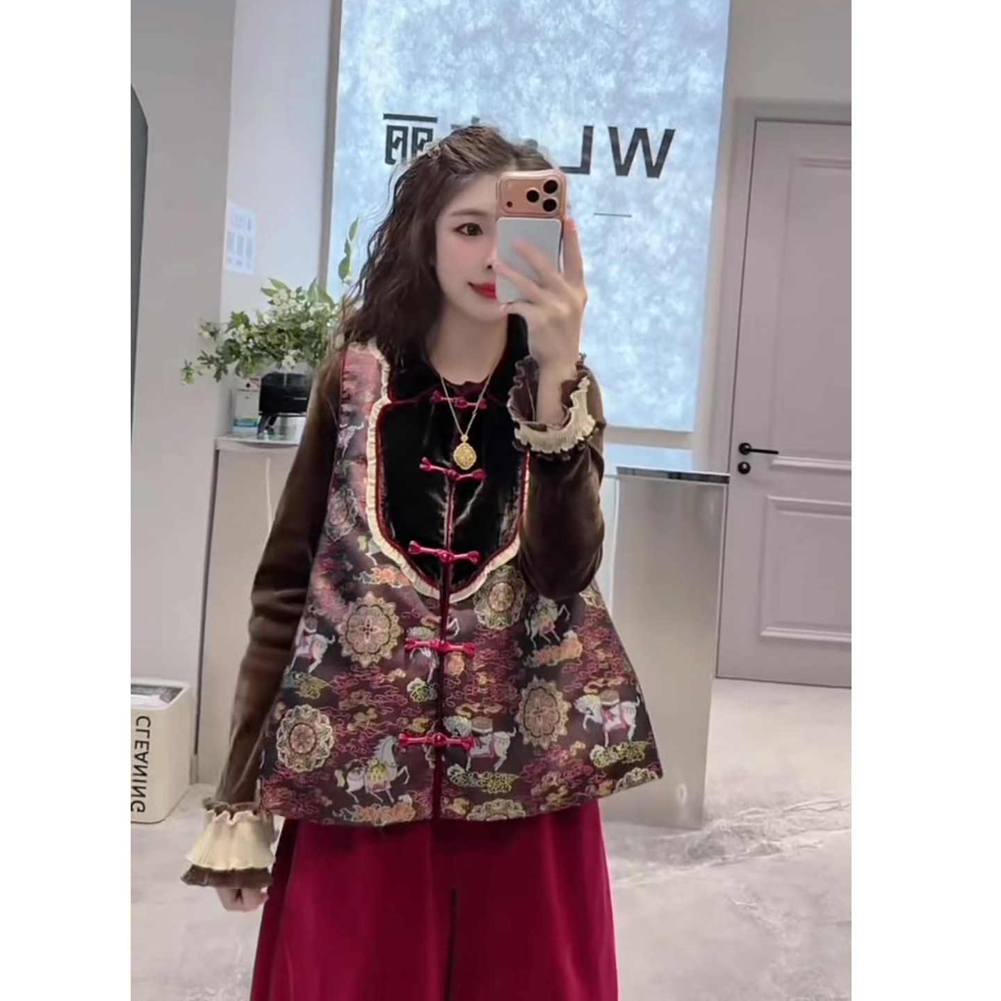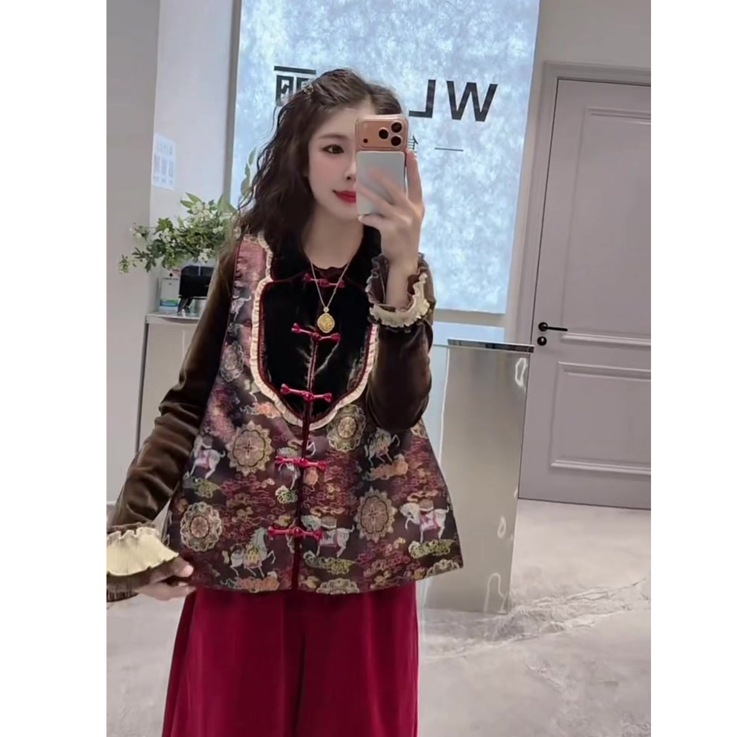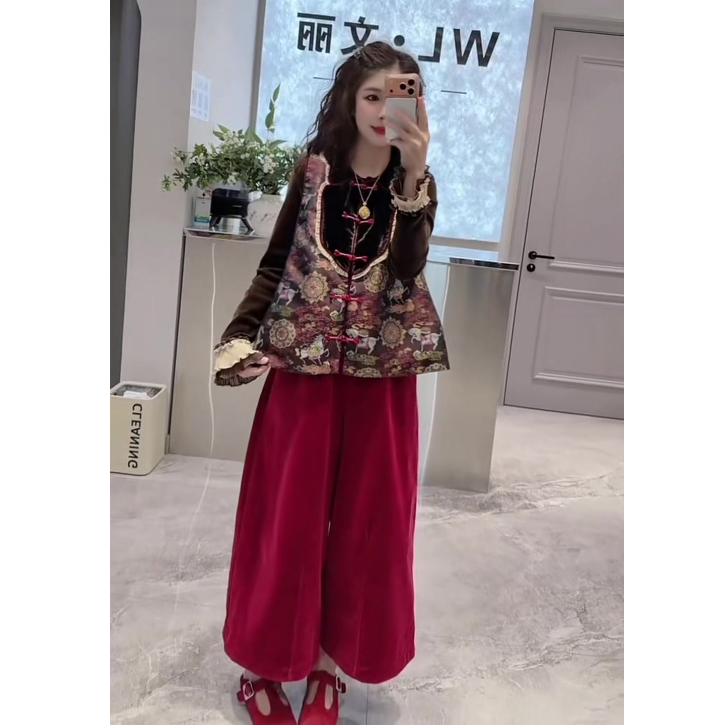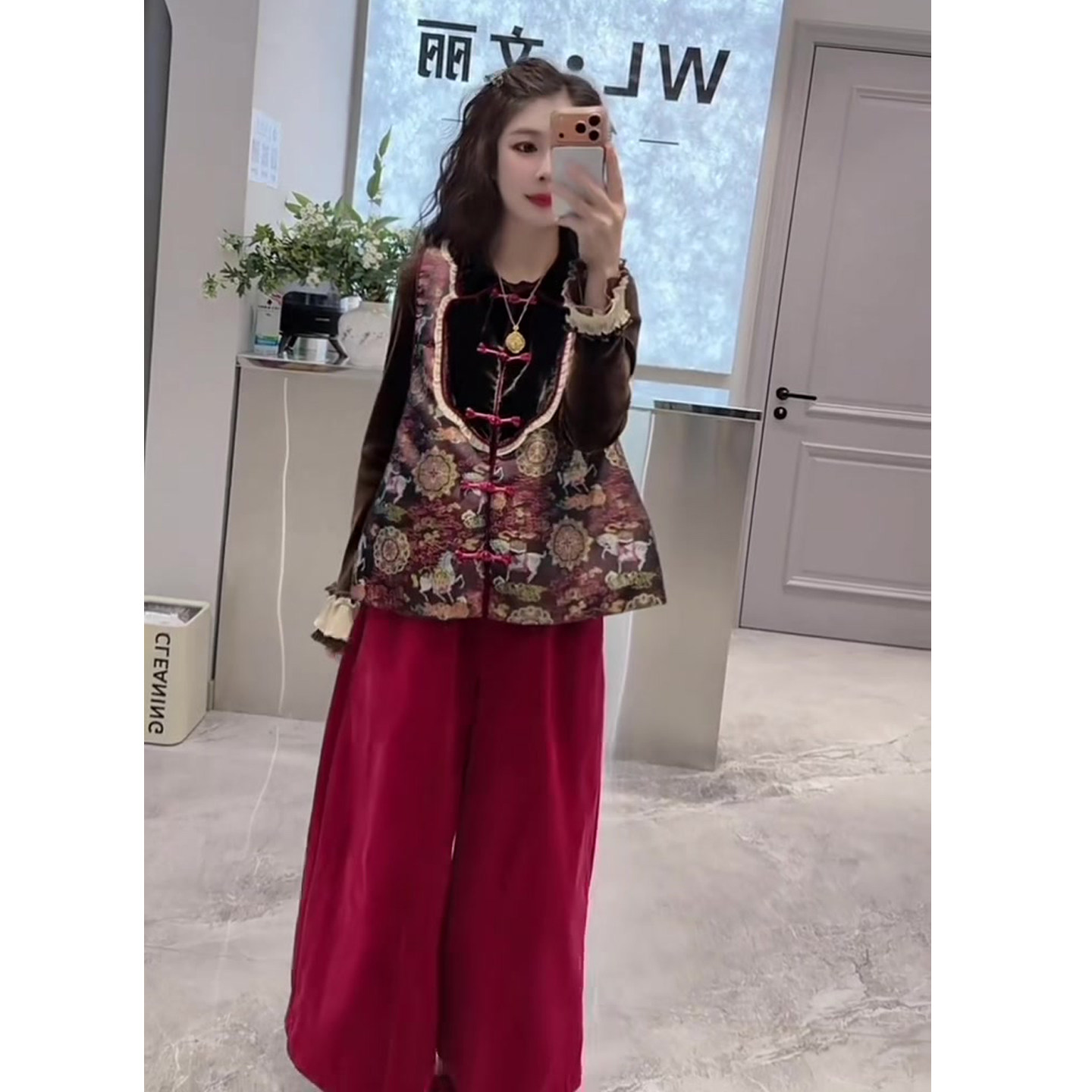 新款 女2025冬季 圆领盘扣马甲 丝绒衫 三件套 民族风时尚 阔腿裤 套装