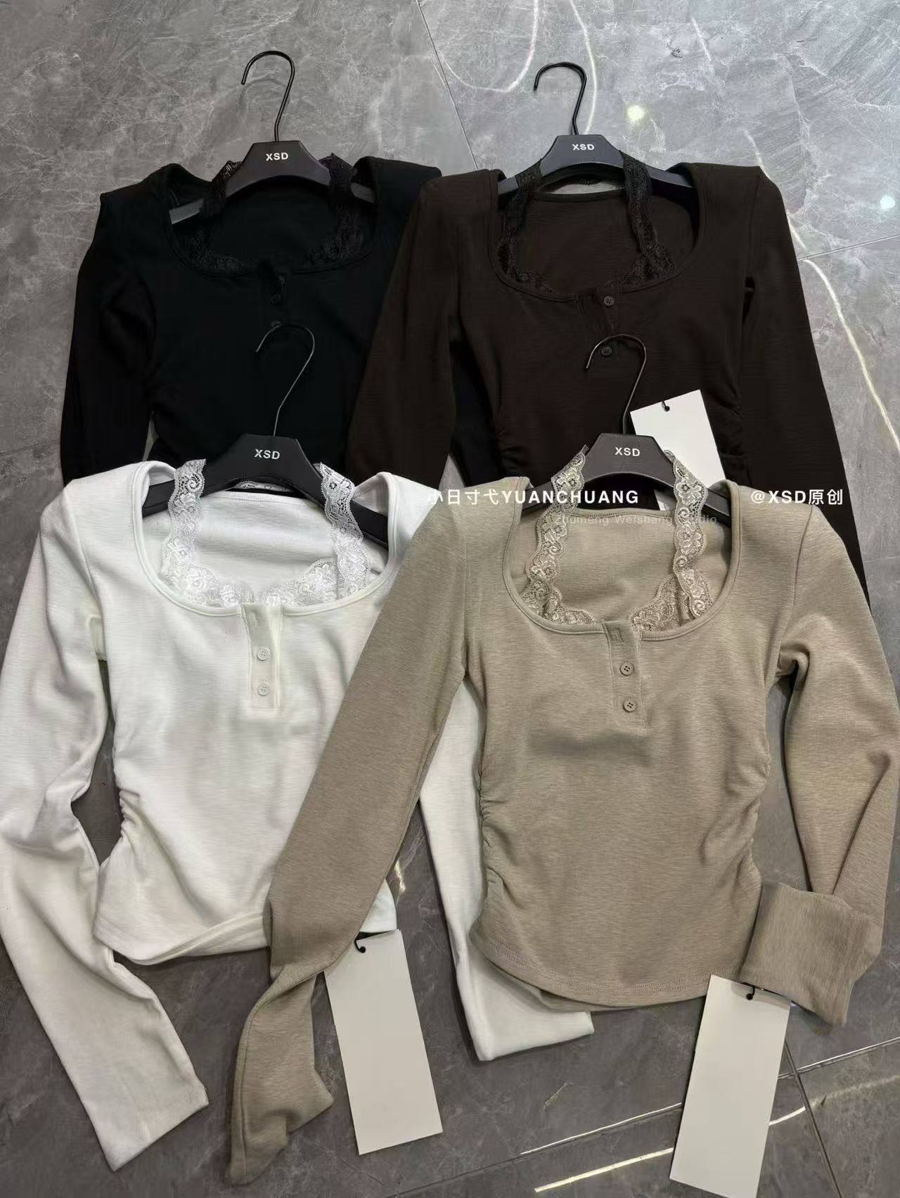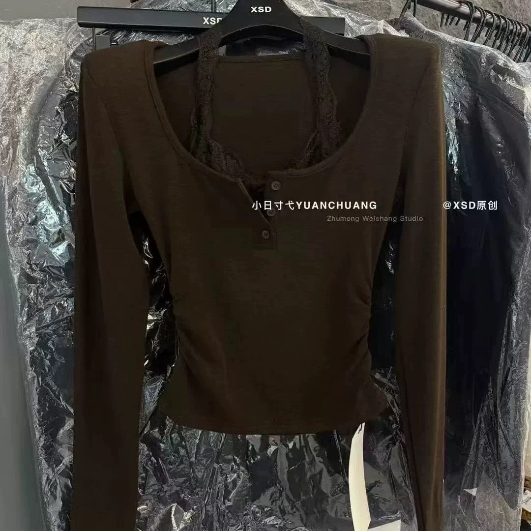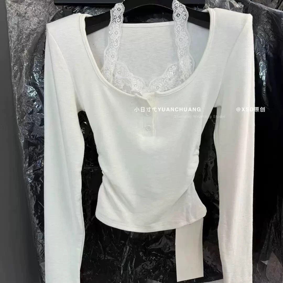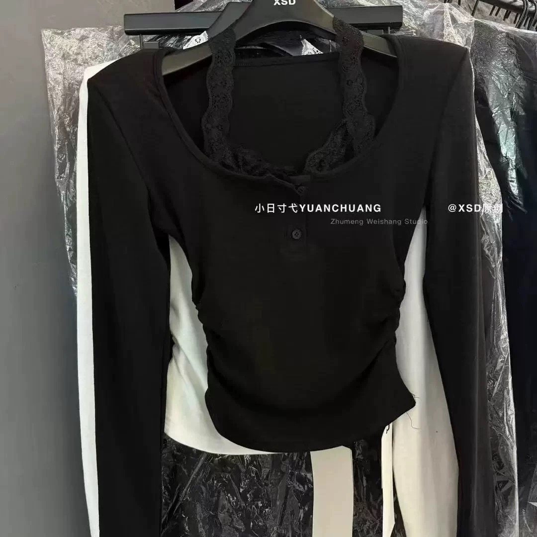 十三行2025秋冬新款 T恤假两件女 磨毛设计感小众挂脖蕾丝拼接长袖