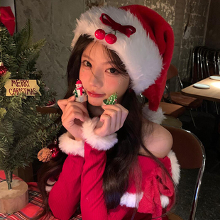 圣诞节红色圣诞帽子女秋冬季 氛围感可爱蝴蝶结毛绒帽拍照道具头饰