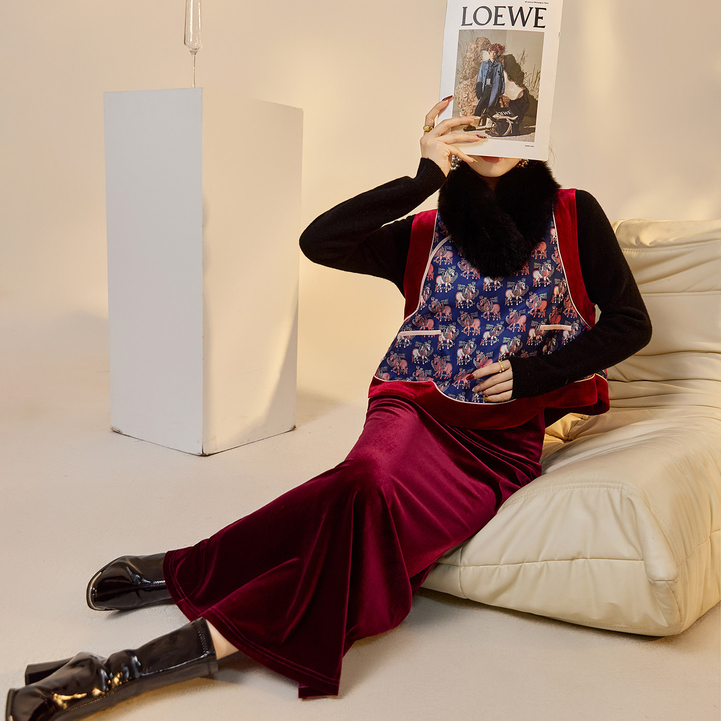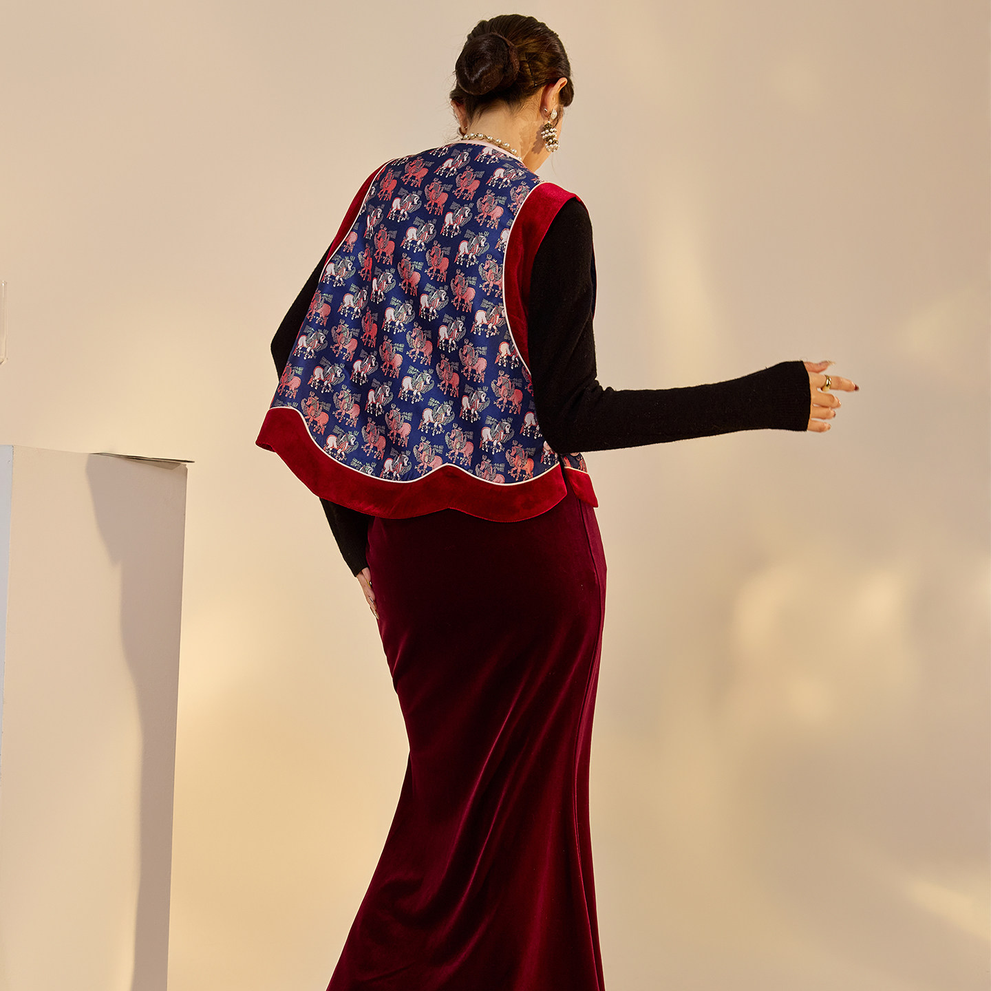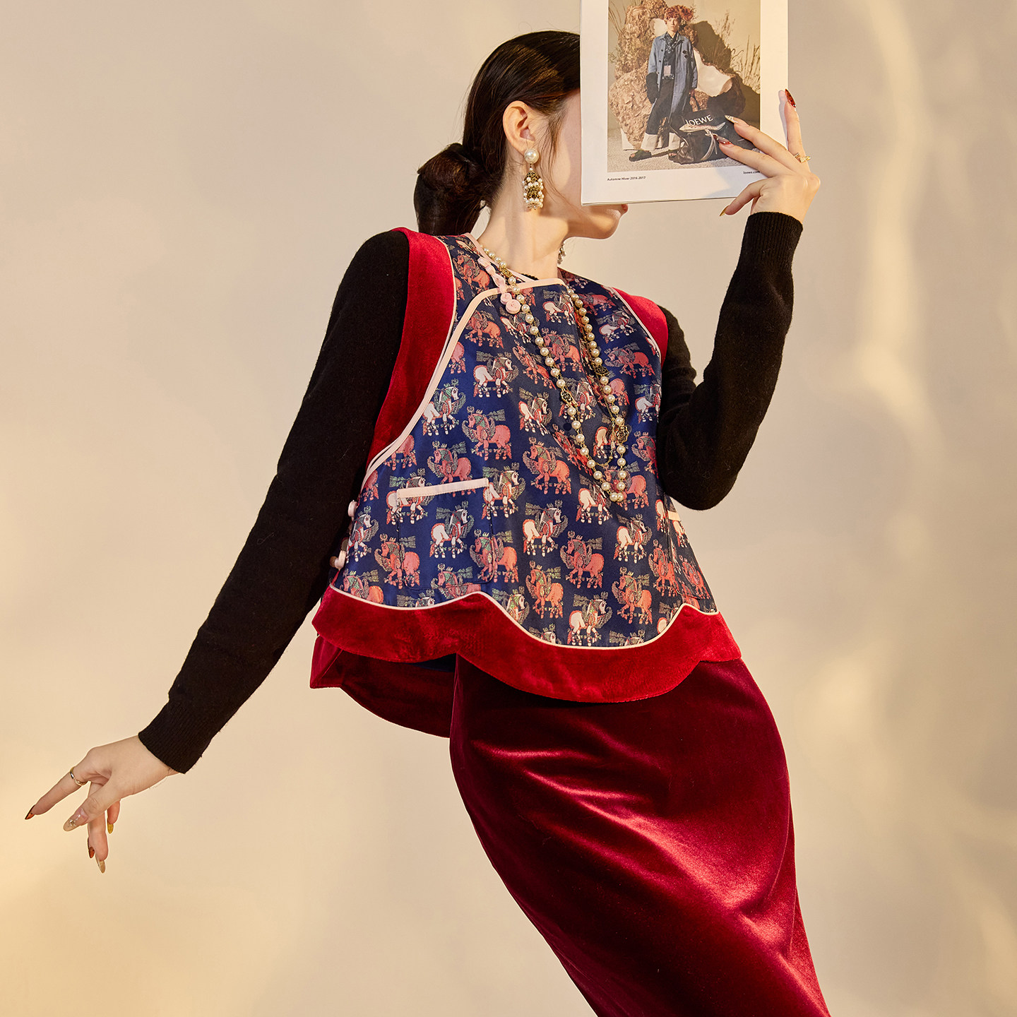 女 丝绒半裙套装 NX030 复古圆领刺绣盘扣华贵感拼色马甲时尚 新中式