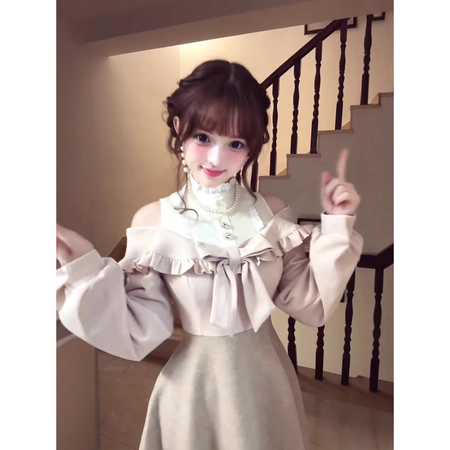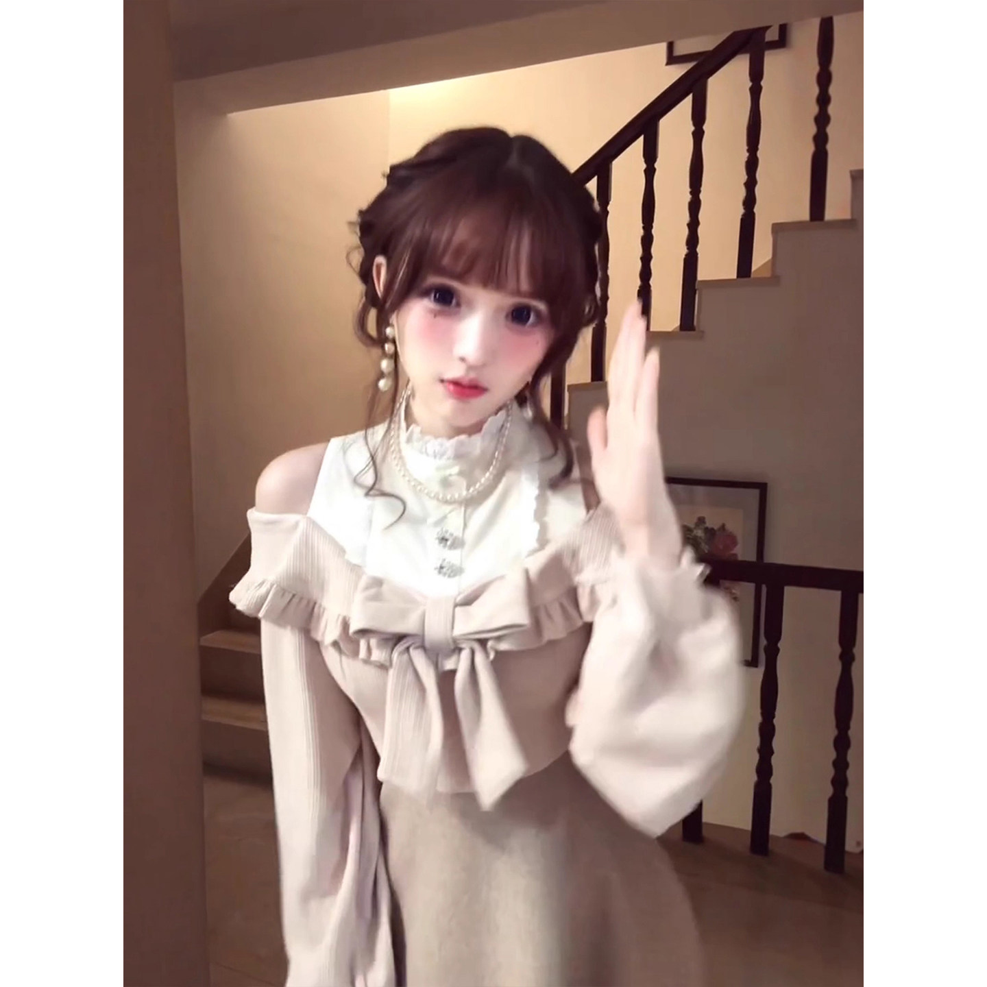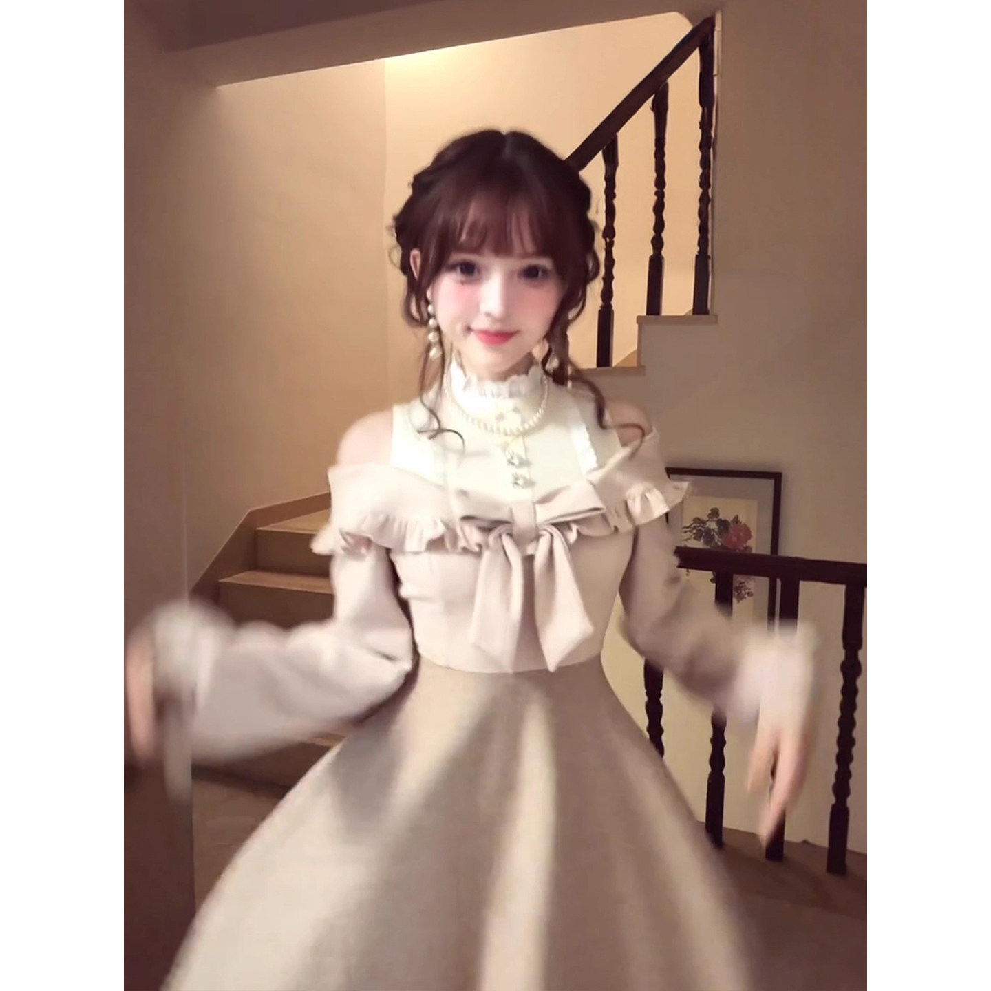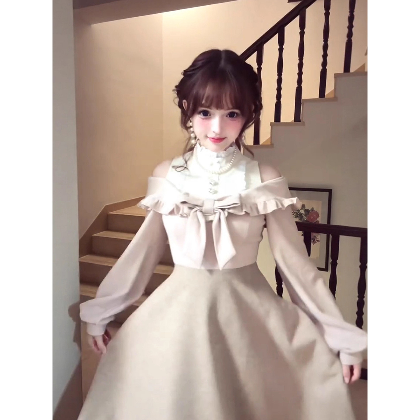 XZY 假两件拼接收腰长裙 微胖日系甜美蝴蝶结露肩连衣裙女25年冬季
