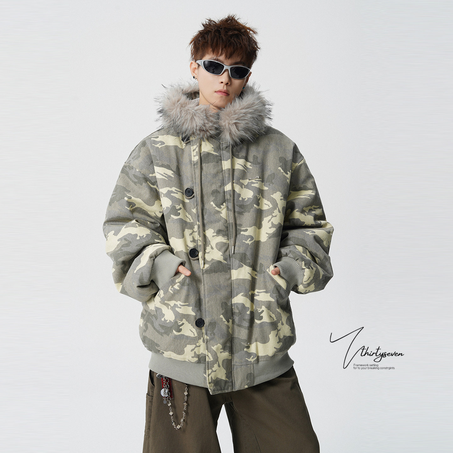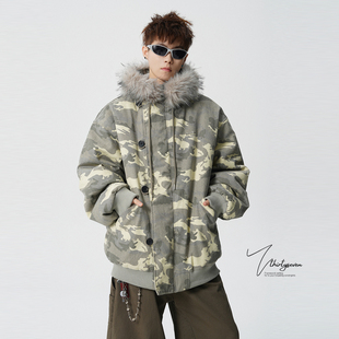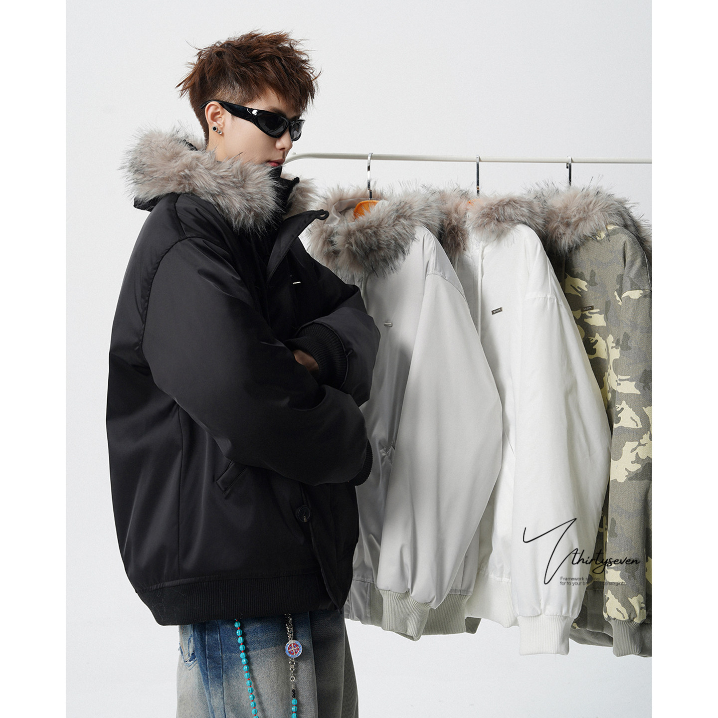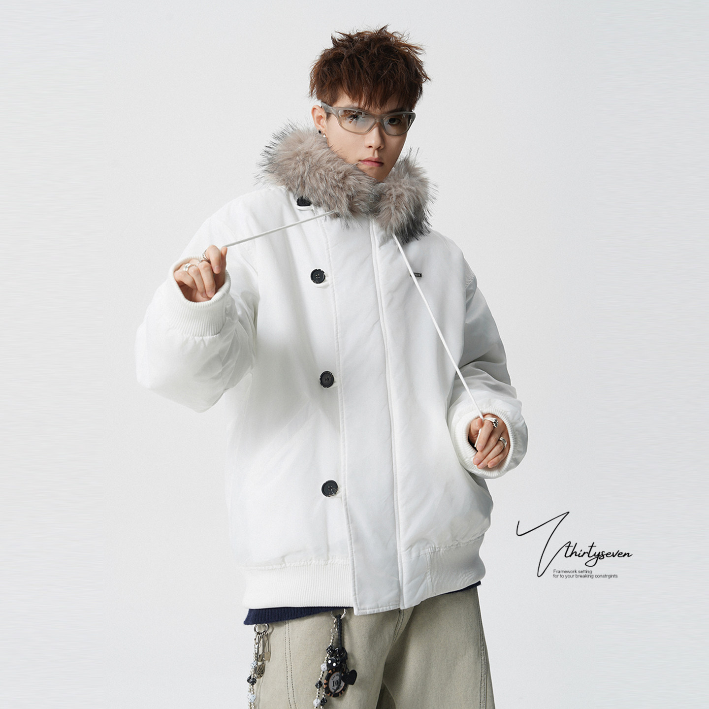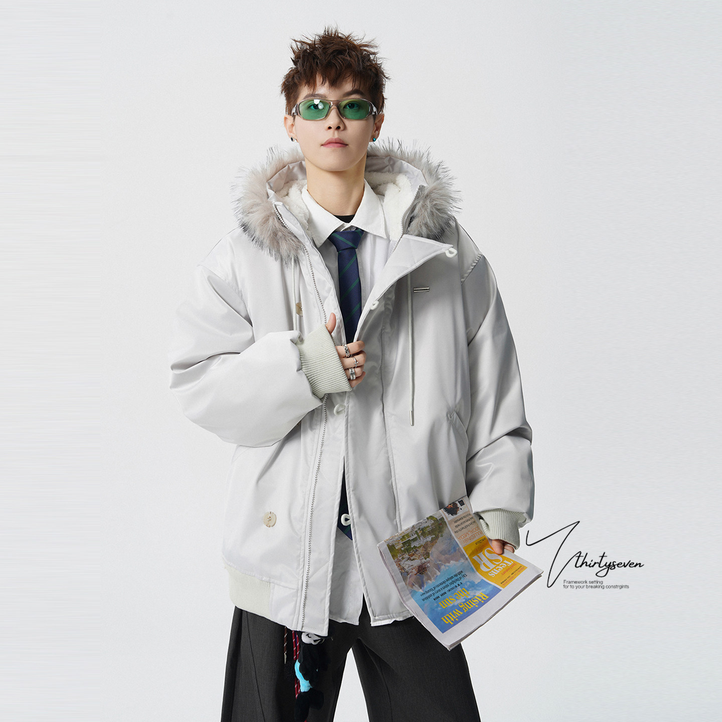 V37美式 派克服加厚保暖夹克棉服 高街大毛领连帽棉衣男冬宽松大码