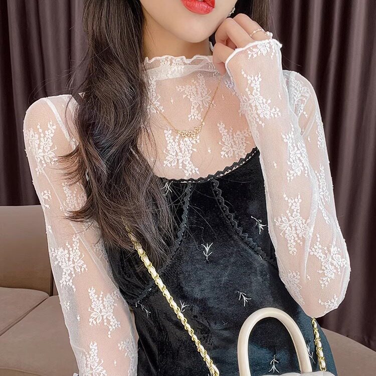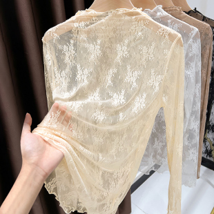 薄款 木耳边网纱打底衫 女秋冬2025新款 透视白色半高领蕾丝内搭小衫