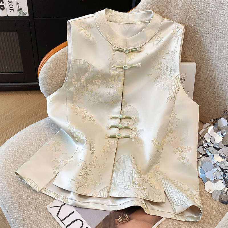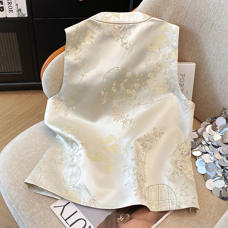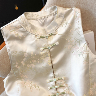 2025新中式 女外套 复古小圆领盘扣国潮民族风缎面织花上衣马甲开衫