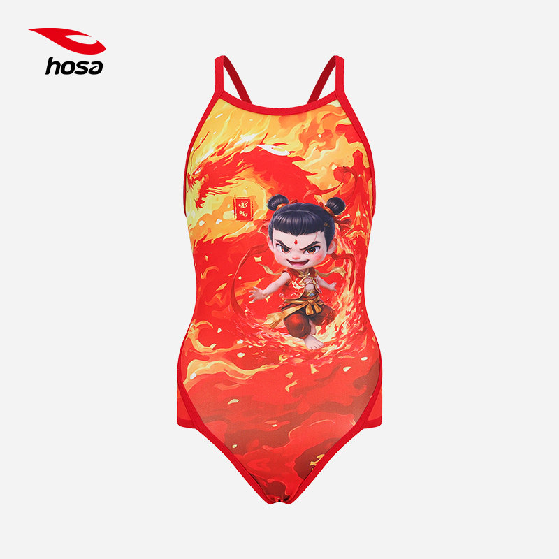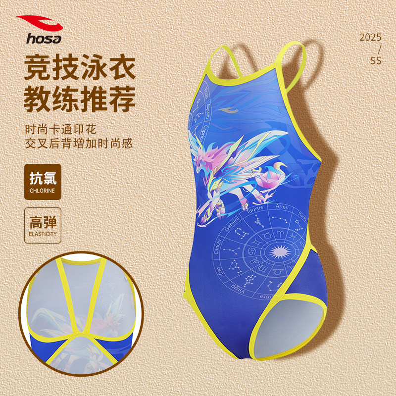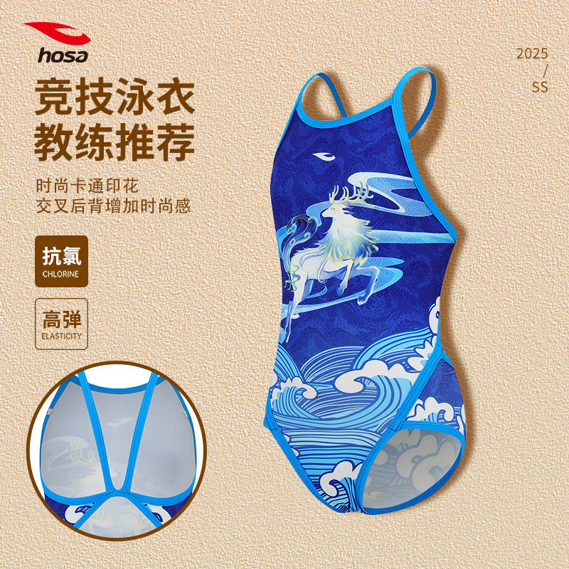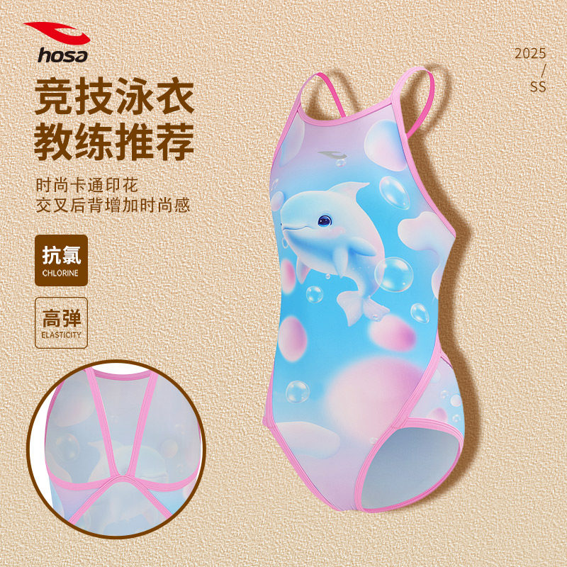 hosa浩沙 女童连体三角泳衣女孩小熊竞速训练比赛游泳馆大童泳装