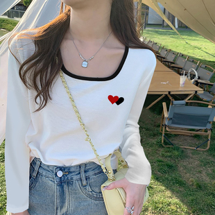 大方领露锁骨上衣修身 打底衫 纯棉白色正肩t恤女 撞色长袖 春秋新款