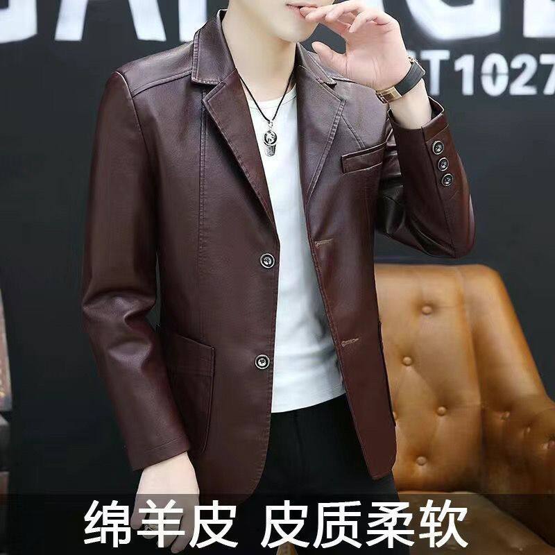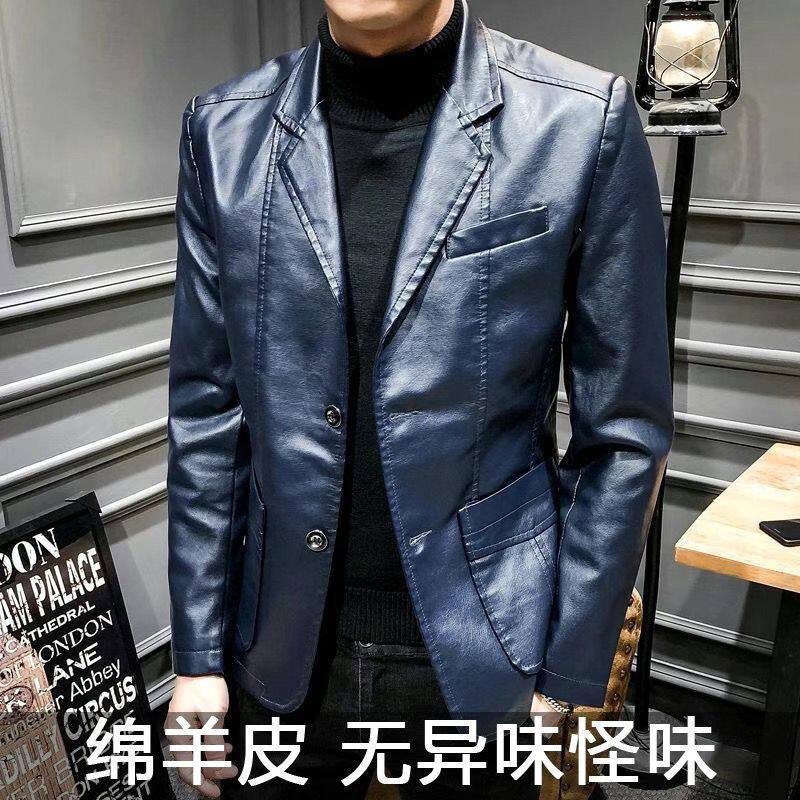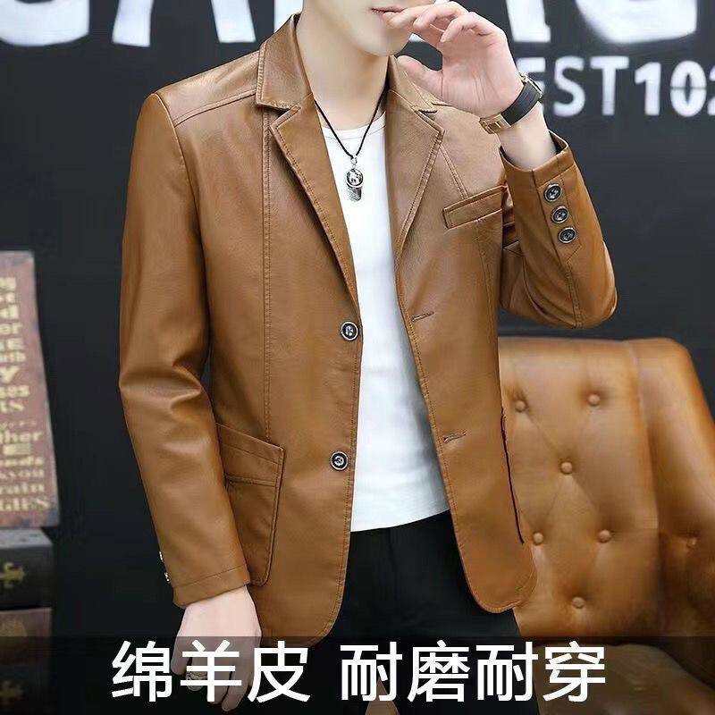 休闲秋冬加绒加厚夹克 海宁西服皮衣男春秋扣子皮西装 品牌断码 韩版