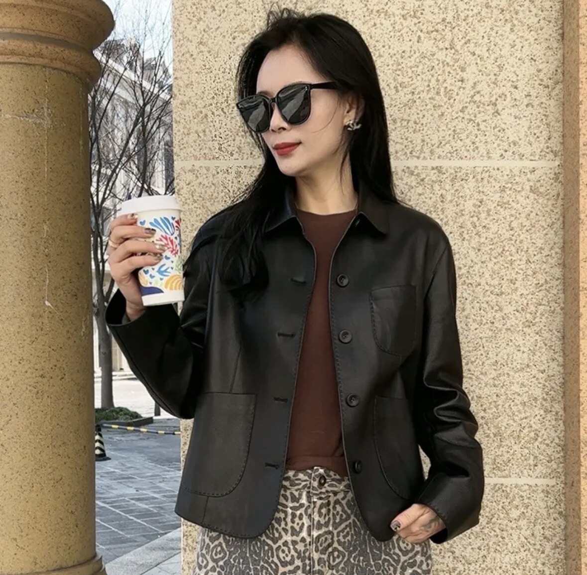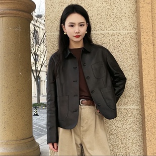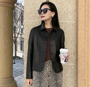 真皮皮衣女长袖 荔枝纹欧美范圆领轻薄显瘦女方领简约绵羊皮短外套