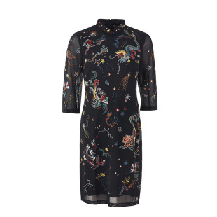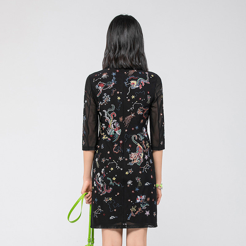 渔牌春装 女弹力中国风刺绣花立领休闲连衣裙FGGA0003 女年新款